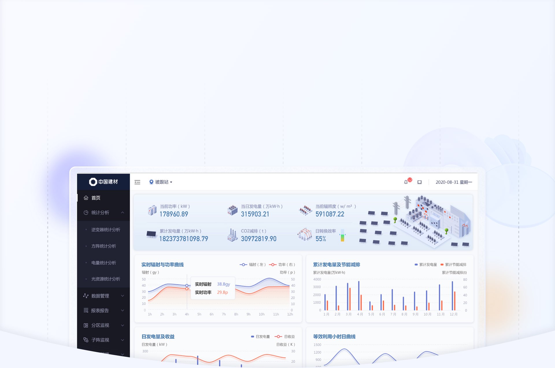 設(shè)計(jì)前期,藍(lán)藍(lán)設(shè)計(jì)通過問卷調(diào)查方式確定客戶風(fēng)格和喜好,并和客戶溝通頁面交互邏輯和優(yōu)化方法,確定交互方式后,再進(jìn)入視覺設(shè)計(jì)階段,這樣可以快速確定設(shè)計(jì)方向,節(jié)省大量時(shí)間。視覺設(shè)計(jì)方面,藍(lán)藍(lán)設(shè)計(jì)嘗試將2.5d圖標(biāo)融入界面設(shè)計(jì)中,通過立體化,場景化的圖標(biāo),更加直觀地展示出產(chǎn)品功能屬性和使用場景,為光伏電站UI設(shè)計(jì)方向提供藍(lán)藍(lán)的設(shè)計(jì)方案。