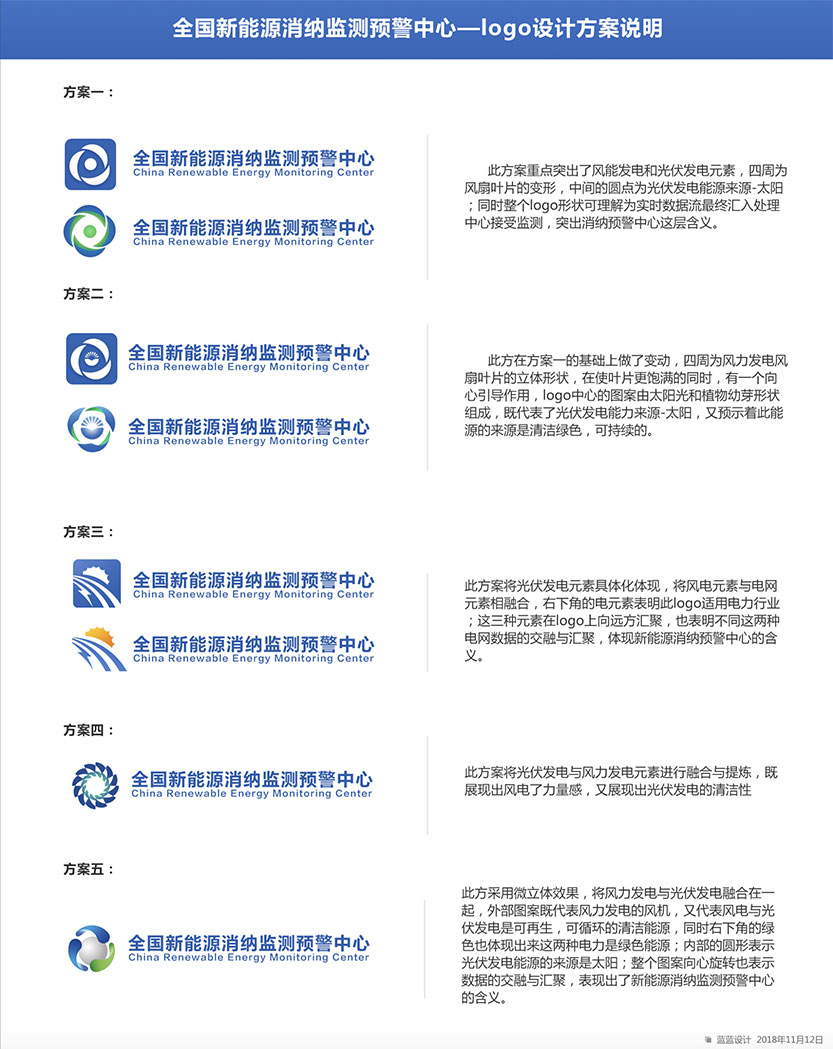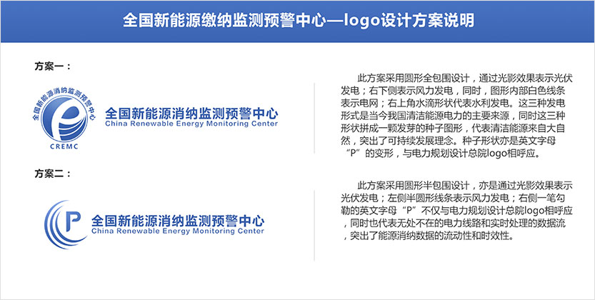 11月5日初次需求調(diào)研提出需求: 1.logo要體現(xiàn)中國電力規(guī)劃總院元素 2.顏色配比與電力規(guī)劃總院保持一致 3.突出風(fēng)電,光伏發(fā)電元素,電網(wǎng)元素和監(jiān)測(cè)動(dòng)態(tài)性 4.樣式設(shè)計(jì)要簡潔,沉穩(wěn)大氣,體現(xiàn)專業(yè)性