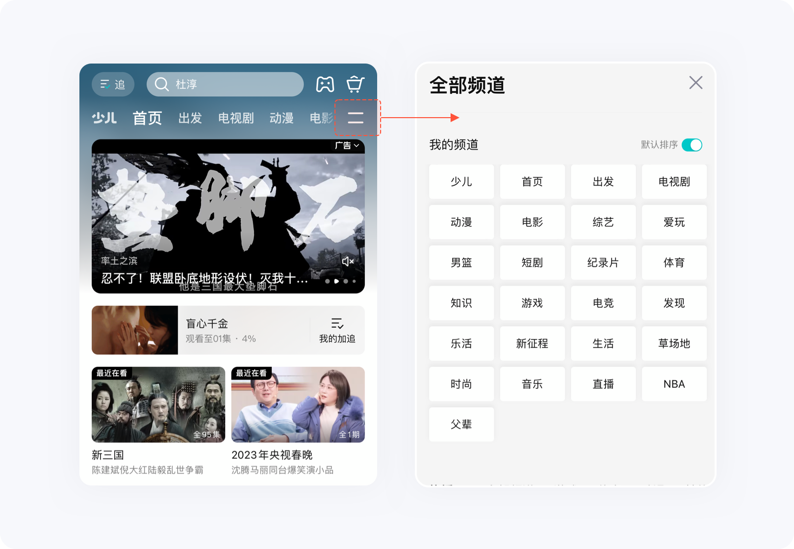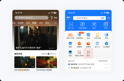 如果大量的選項(xiàng)無(wú)法減少,可將重要選項(xiàng)靠前,將其他的隱藏起來(lái),方便用戶決策及降低失誤操作的概率。例如騰訊視頻頂部分類后面的更多圖標(biāo)、支付寶首頁(yè)金剛區(qū)的更多入口,點(diǎn)開(kāi)后就會(huì)發(fā)現(xiàn),里面隱藏了非常多的功能,這樣做能減少用戶認(rèn)知負(fù)荷,提高信息篩選的效率。