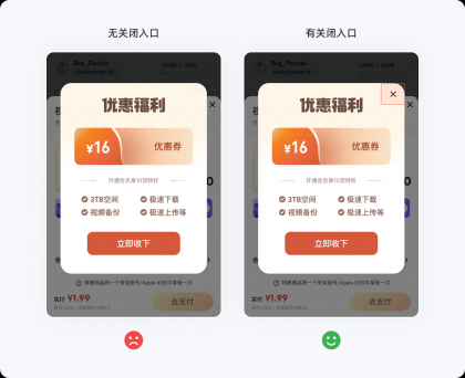 希克定律要做的是通過(guò)減少用戶做決定的時(shí)間,來(lái)提升轉(zhuǎn)化率以及用戶體驗(yàn),但不管在什么情況下,用戶都希望自己還擁有選擇的權(quán)利,如果設(shè)計(jì)師自作聰明的將選項(xiàng)減到只剩一個(gè),就相當(dāng)于告知用戶必須接受,那么用戶就有種被強(qiáng)制、綁架的感覺(jué),只會(huì)存在兩個(gè)結(jié)果:①被你的產(chǎn)品拿捏、②離開(kāi)你的產(chǎn)品,筆者相信第一種可能性的概率極低,畢竟同類型的產(chǎn)品并不是只有你一家(壟斷除外)。如下圖的彈窗,用戶即便不愿意進(jìn)入任務(wù)流程,可別無(wú)選擇,只能進(jìn)入后再返回才能回到原位,這種做法無(wú)端增加用戶的操作成本,極易引起反感情緒。不管產(chǎn)品如何希望用戶轉(zhuǎn)化,切不可強(qiáng)制他們接受,需要給用戶留一條返回的“路”,即便不那么起眼,至少還有選擇的權(quán)利。