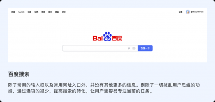 網(wǎng)頁通過大面積的留白營造平和感,通過高反差的對比創(chuàng)造視覺焦點,將必要的信息烘托出來,然后借助留白包圍它們。通過這種方式把核心信息凸顯出來,當用戶進入該搜索頁時,只做必要的事情,關注重要的信息。