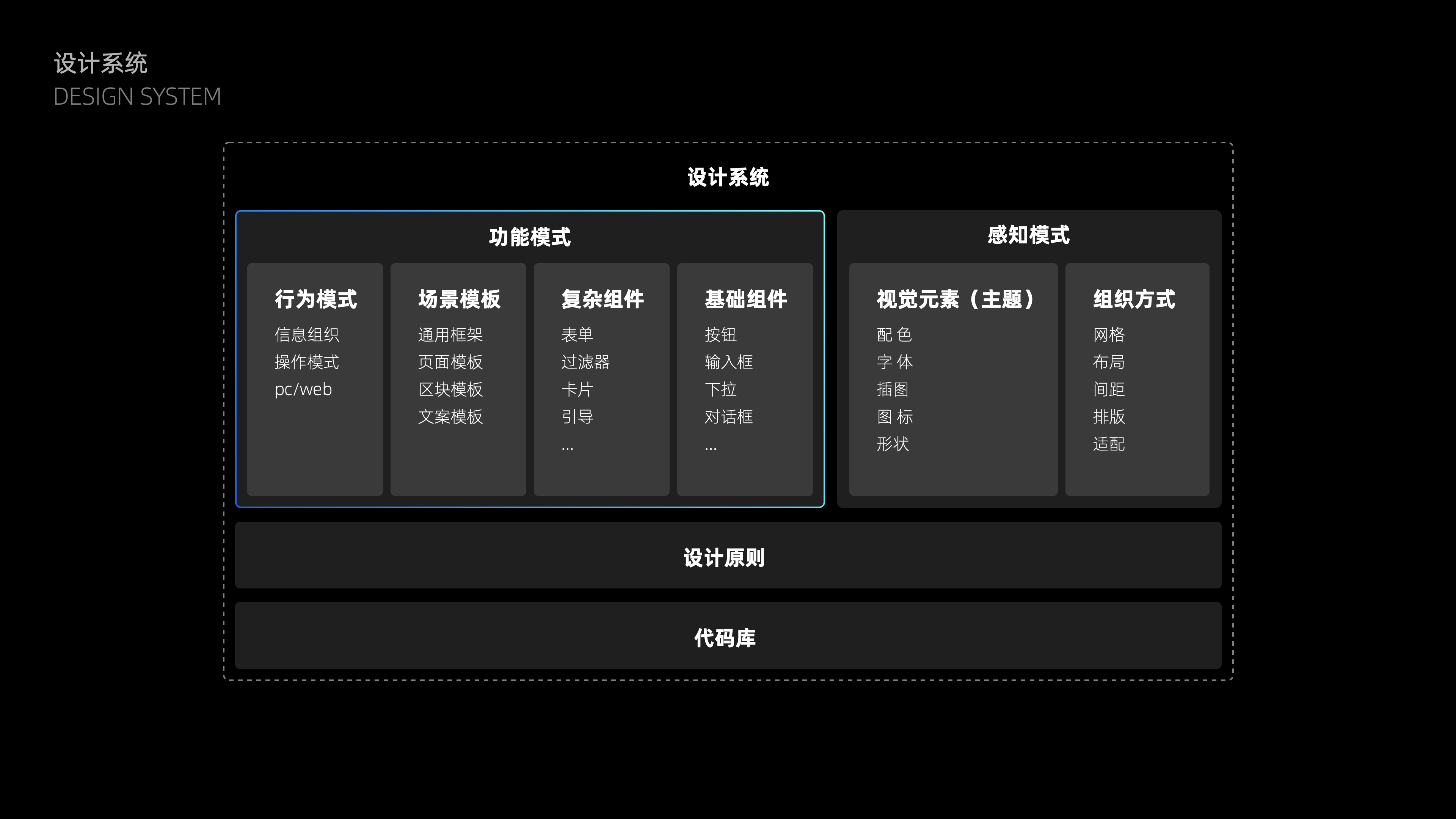 大多數(shù)日常需求大多是從單點(diǎn)出發(fā),當(dāng)點(diǎn)變多變復(fù)雜了,就容易出現(xiàn)上述說(shuō)到的現(xiàn)狀問(wèn)題。所以解決方案需要基于業(yè)務(wù)全盤(pán)進(jìn)行設(shè)計(jì)抽象:從元素——組件——區(qū)塊——頁(yè)面——功能流程沉淀設(shè)計(jì)規(guī)則并代碼化,來(lái)靈活提供拼裝N個(gè)不同頁(yè)面的機(jī)制,幫助團(tuán)隊(duì)更系統(tǒng)化的進(jìn)行產(chǎn)品設(shè)計(jì)。從組成內(nèi)容不難看出,解決方案是需要建立在基礎(chǔ)組件基礎(chǔ)上,與基礎(chǔ)組件、復(fù)雜組件、行為模式共同組成設(shè)計(jì)系統(tǒng)的【功能模式】部分。