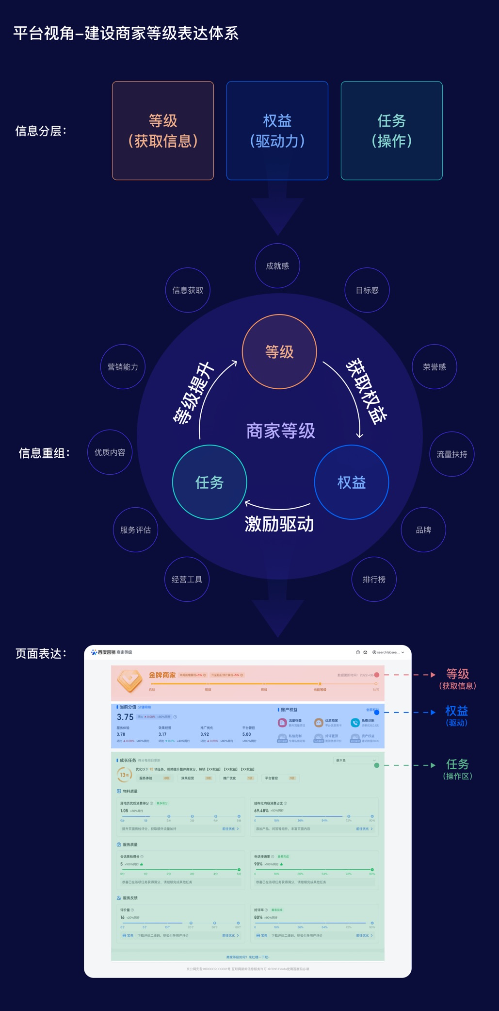 信息重組:分層后,將商家置于設(shè)計(jì)的核心位置,通過深入理解商家需求、行為和期望,以確保設(shè)計(jì)方案符合商家的真實(shí)需求。例如在商家等級場景,商家期望獲取更多權(quán)益,獲取更多的C端展現(xiàn)。所以此場景以權(quán)益作吸引,通過披露待解鎖權(quán)益驅(qū)動(dòng)商家完成任務(wù),提升等級。