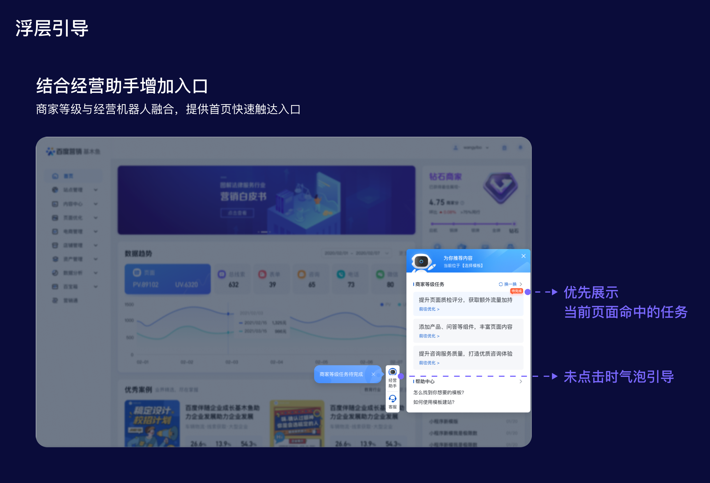 浮層:將操作入口前置披露,提升商家感知同時(shí)還可以縮短操作步長。在商家等級項(xiàng)目里,衡量商家主動(dòng)經(jīng)營的標(biāo)準(zhǔn)是做任務(wù),所以任務(wù)入口的前置披露是提升主動(dòng)經(jīng)營的關(guān)鍵舉措。于是,圍繞商家等級包裝了“經(jīng)營助手”的概念,幫助平臺(tái)給商家推薦一些成長任務(wù)和優(yōu)化建議,并在平臺(tái)首頁主動(dòng)彈出,以此提高任務(wù)觸達(dá)率。但使用這種主動(dòng)觸達(dá)手段時(shí),需要考慮對商家的打擾和阻斷情況,所以需要對主動(dòng)彈出的頻率作限制,然后配合氣泡和標(biāo)簽等視效元素吸引商家視線。這樣可以引導(dǎo)商家參與商家等級完成任務(wù),促進(jìn)其成長和等級提升。