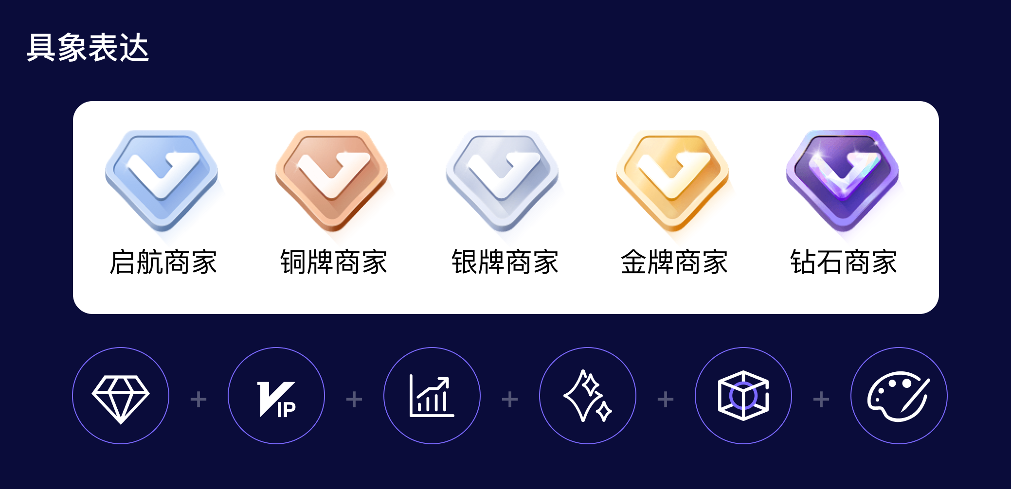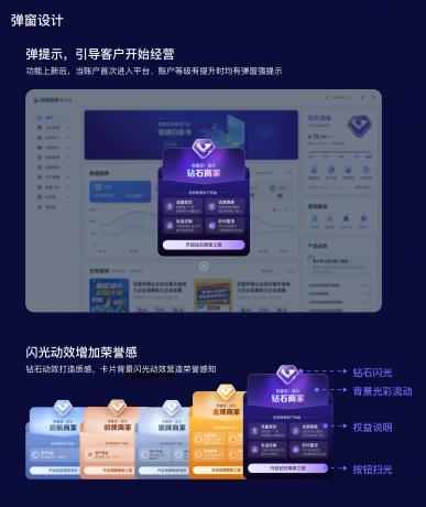 設(shè)計(jì)的基本出發(fā)點(diǎn)是幫助業(yè)務(wù)建設(shè)平臺(tái)等級模型的表達(dá)體系,將業(yè)務(wù)目標(biāo)轉(zhuǎn)化為用戶行為,設(shè)計(jì)清晰而直觀的商家分層表達(dá)體系,將不同商家等級與其對應(yīng)的特權(quán)、服務(wù)等信息進(jìn)行明確的關(guān)聯(lián)和傳達(dá),以便商家能夠快速理解和辨識(shí)商家等級的差異和優(yōu)勢。