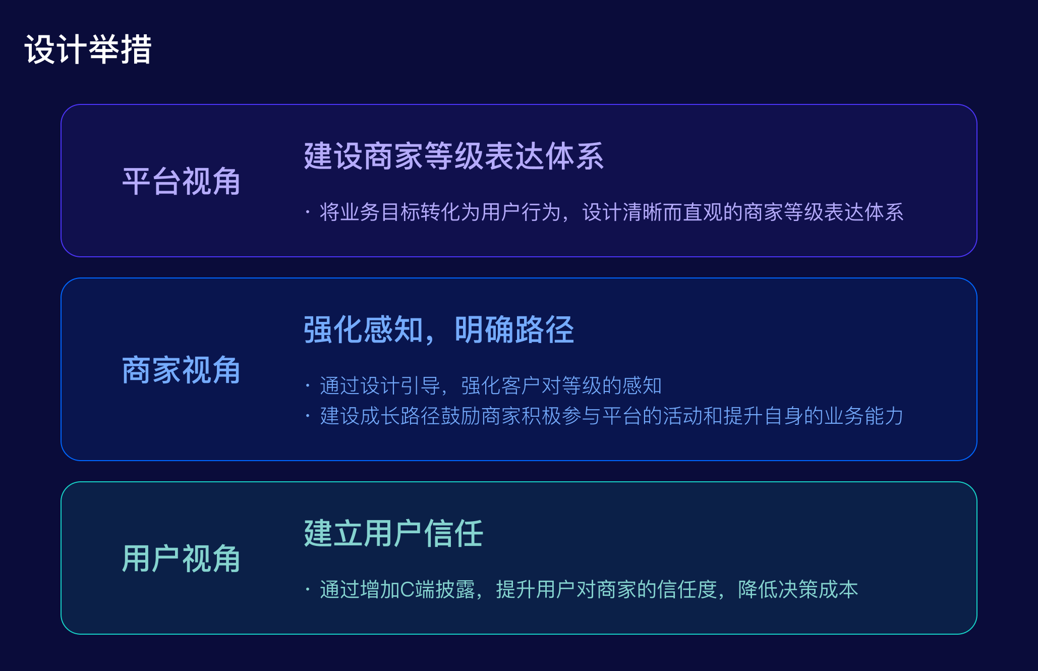 綜合以上分析,設(shè)計(jì)舉措應(yīng)注重建立商家等級表達(dá)、強(qiáng)化商家的感知和增強(qiáng)用戶的信任。希望通過設(shè)計(jì)目標(biāo)的實(shí)現(xiàn),為商家分層模型帶來更好的用戶體驗(yàn)和商業(yè)效益,提升商家的參與度和忠誠度,促進(jìn)商業(yè)生態(tài)飛輪的正向運(yùn)轉(zhuǎn)。