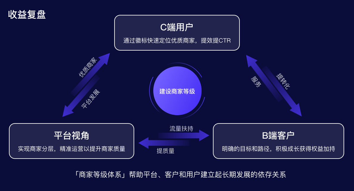 平臺(tái)通過建設(shè)商家等級,將商家分層并提供適配的服務(wù),實(shí)現(xiàn)了精準(zhǔn)運(yùn)營;商家等級給商家?guī)淼臋?quán)益吸引和任務(wù)引導(dǎo),促進(jìn)了商家活躍度和質(zhì)量的大幅提升;C端披露的等級徽標(biāo)幫助用戶快速鑒別優(yōu)質(zhì)商家,頁面的CTR有顯著的正向增長,商業(yè)生態(tài)下的商家等級激勵(lì)體系已初步建成。但后期在做客戶訪談的過程中,有客戶反饋某些權(quán)益感知度比較弱。權(quán)益是吸引商家的核心驅(qū)動(dòng)力,如何圍繞權(quán)益建設(shè)開展有效的設(shè)計(jì)?這是應(yīng)該是接下來需要展開研究的課題。