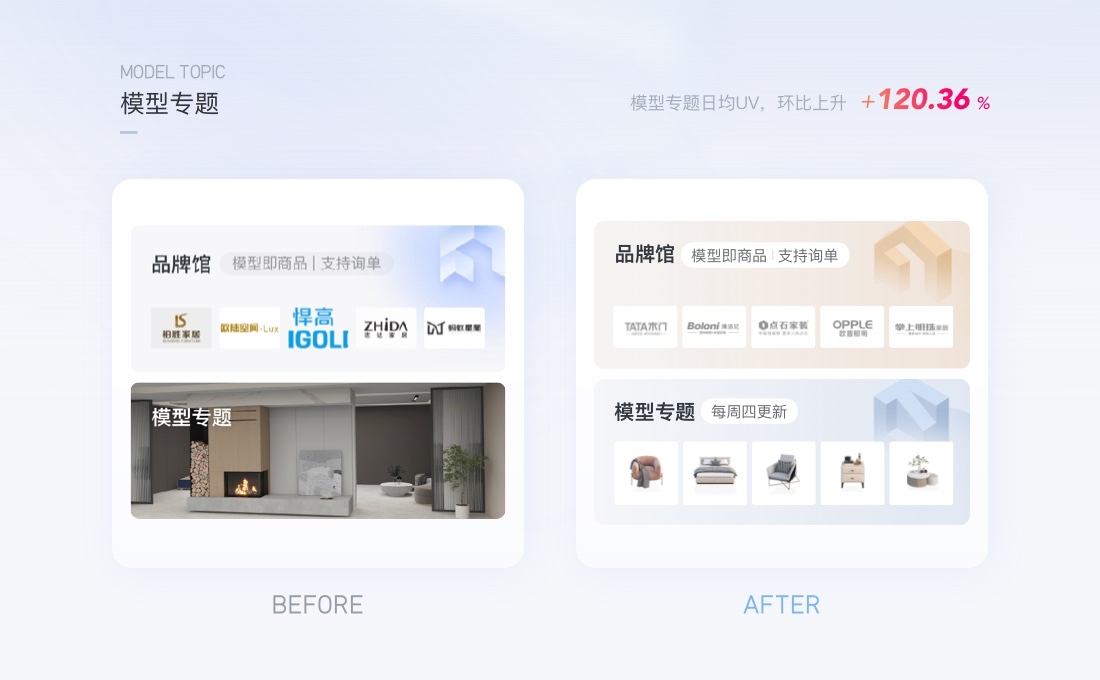 群核下的設(shè)計(jì)工具,以專題化的形式聚類商家、平臺推薦的模型是基本的運(yùn)營動作,如下圖,原本以真實(shí)效果圖的方式展示模型專題,用戶難以感知是方案還是模型。通過封面圖形的優(yōu)化:將核心的模型類型展示出來,用戶能夠預(yù)見里面的內(nèi)容。