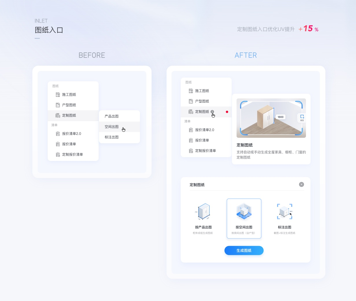 在新版優(yōu)化中圖形化的表達(dá)了圖紙類型的差異,即便增加了流程步驟數(shù),最終用戶點(diǎn)擊圖紙的UV提升了15%,此案例可以說明,更精準(zhǔn)有效的對象表達(dá)能吸引更多用戶來使用此功能,對業(yè)務(wù)產(chǎn)生直接效果。
