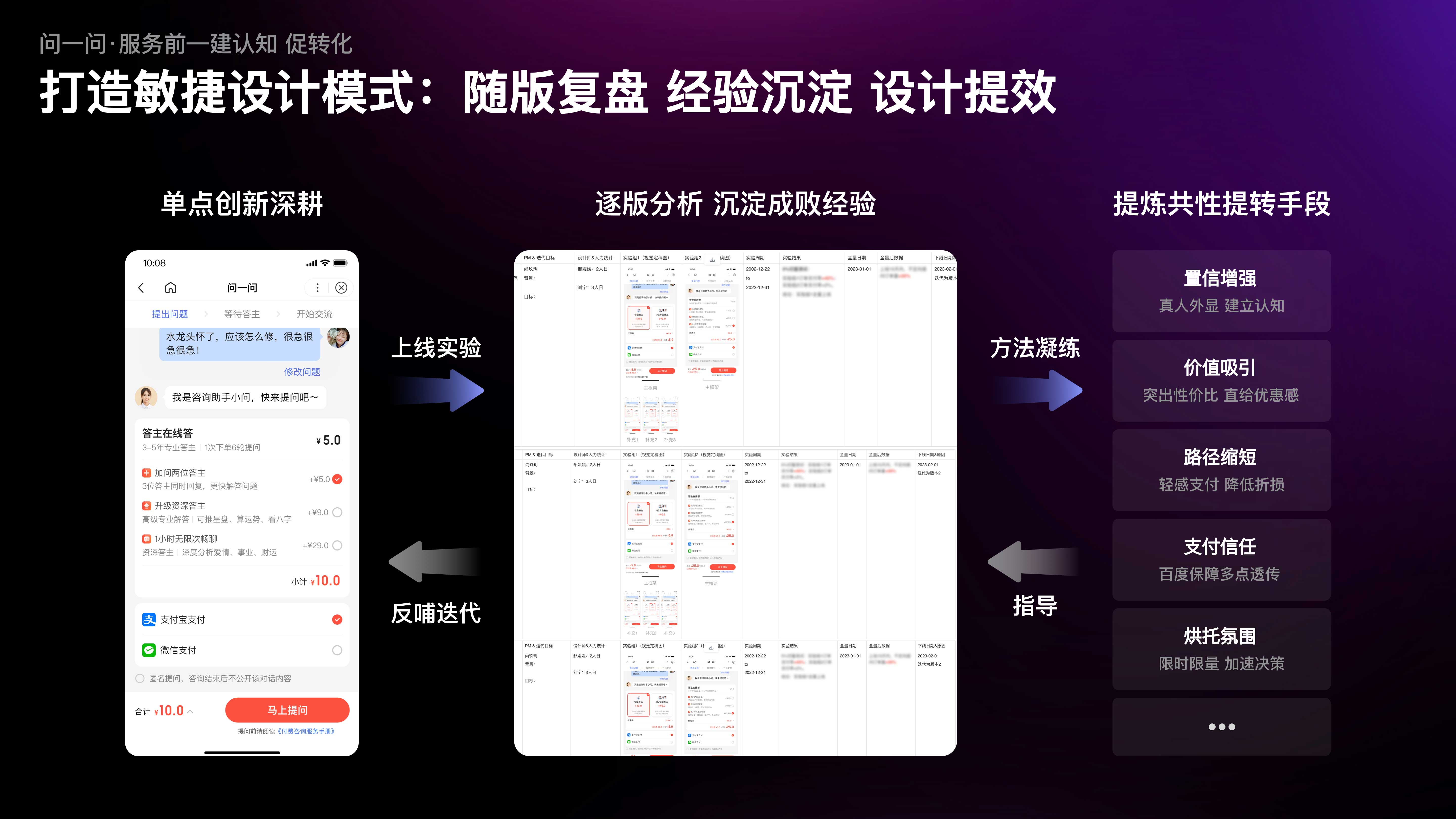 ?為了進(jìn)一步提升設(shè)計(jì)效率,我們將提問(wèn)頁(yè)的迭代歷史進(jìn)行線(xiàn)上化記錄,并組織團(tuán)隊(duì)定期復(fù)盤(pán)總結(jié),提煉出「真人外顯-增強(qiáng)置信感」「優(yōu)惠直給-突出性?xún)r(jià)比」「路徑縮短-弱化支付感」等一系列通用的提轉(zhuǎn)手段;又將這些手段復(fù)用到服務(wù)上下游環(huán)節(jié)的同類(lèi)場(chǎng)景中,通過(guò)系統(tǒng)化提轉(zhuǎn),有效幫助業(yè)務(wù)訂單量、GMV大幅提升。