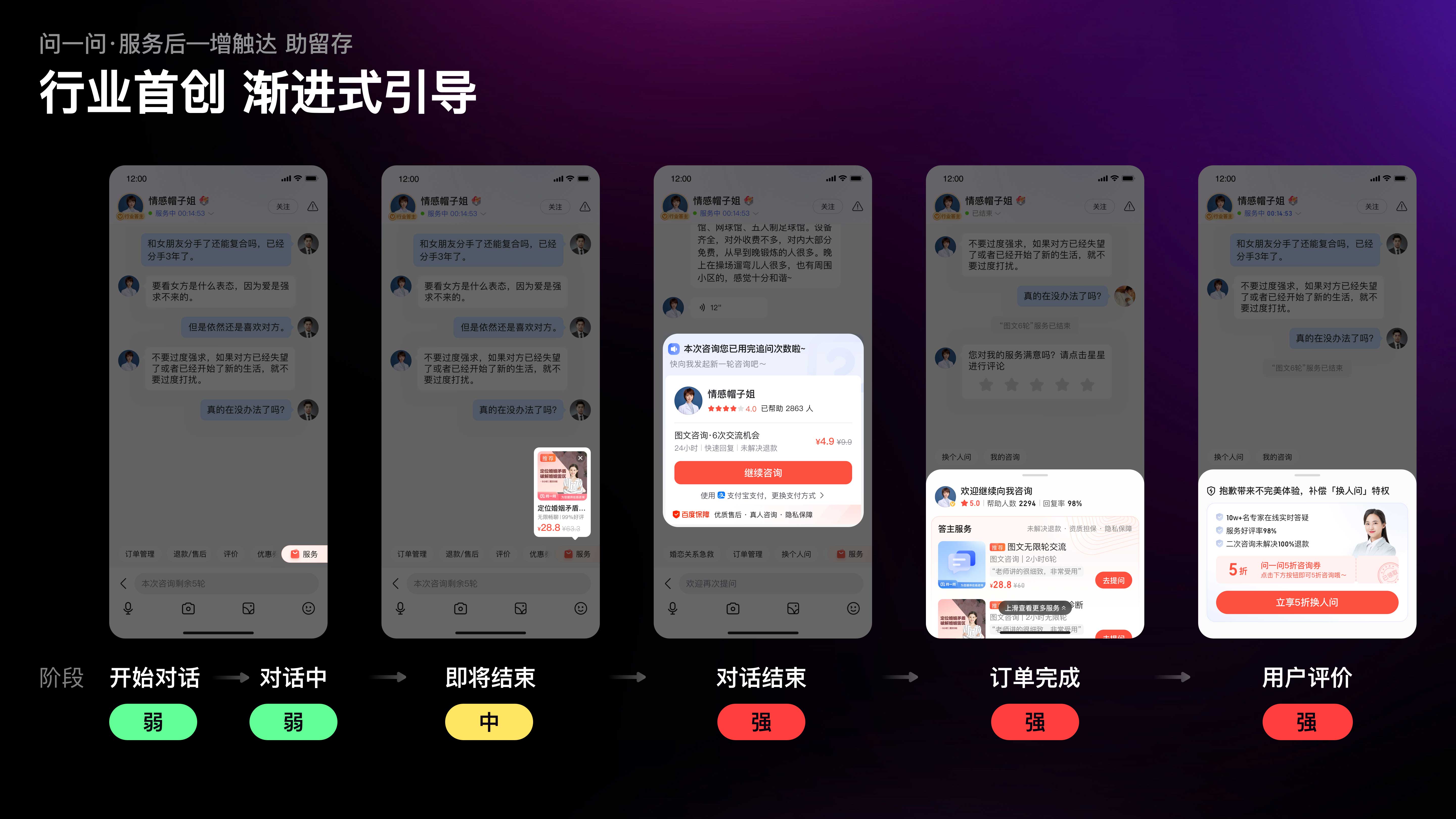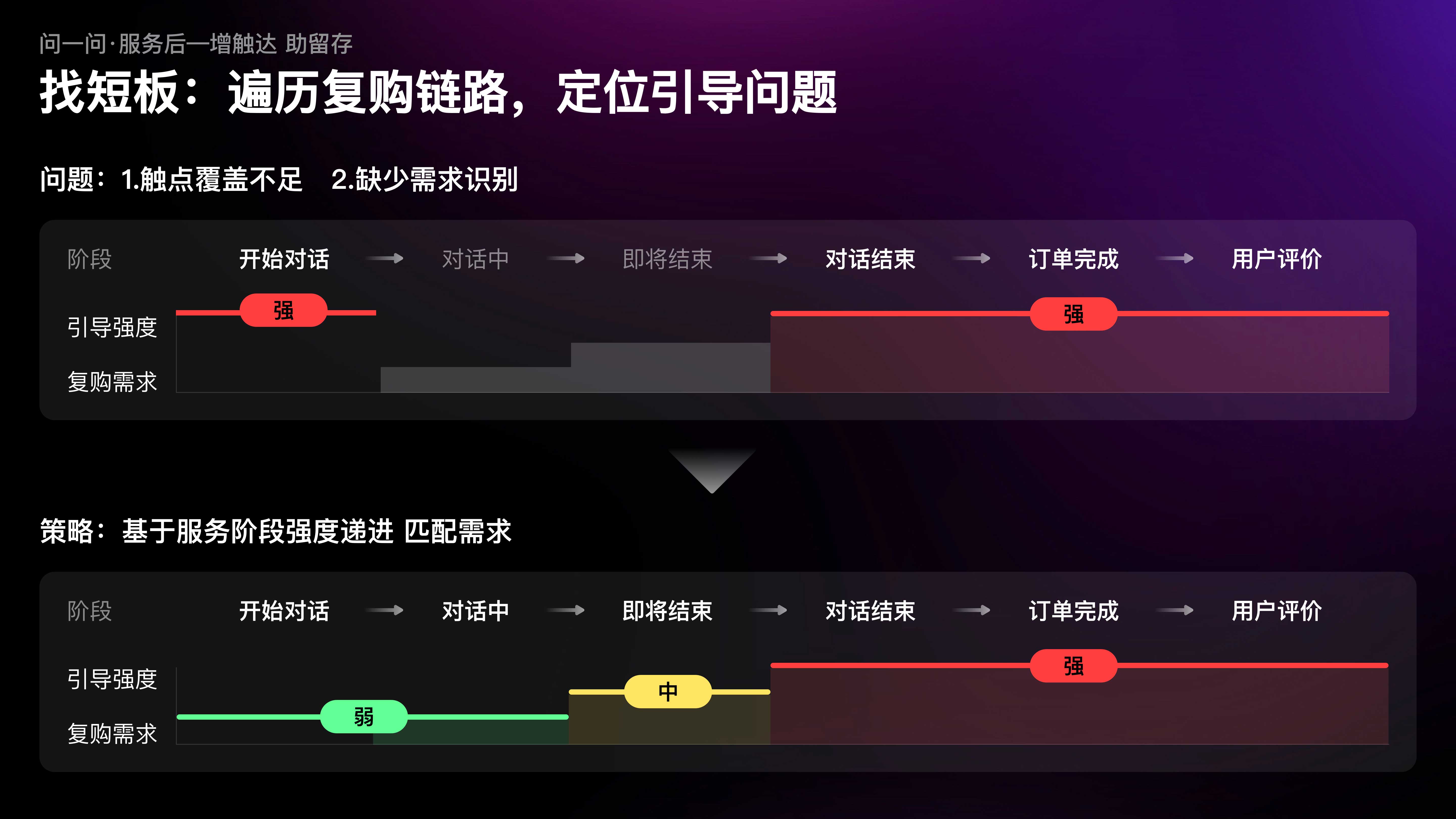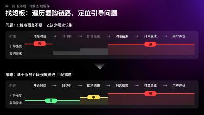 當(dāng)我們以用戶(hù)視角,遍歷咨詢(xún)鏈路中的復(fù)購(gòu)引導(dǎo)時(shí),發(fā)現(xiàn)復(fù)購(gòu)引導(dǎo)的觸點(diǎn)覆蓋不足,且缺少對(duì)特定場(chǎng)景下需求的識(shí)別,例如在咨詢(xún)開(kāi)始時(shí)復(fù)購(gòu)需求極弱,但設(shè)計(jì)引導(dǎo)極強(qiáng);而在隨后的對(duì)話(huà)過(guò)程中需求漸增,但引導(dǎo)缺失。因此,我們制定了行業(yè)首創(chuàng)的漸進(jìn)式引導(dǎo)策略;隨著服務(wù)推進(jìn),復(fù)購(gòu)需求漸增,觸達(dá)強(qiáng)度也逐級(jí)遞進(jìn)。