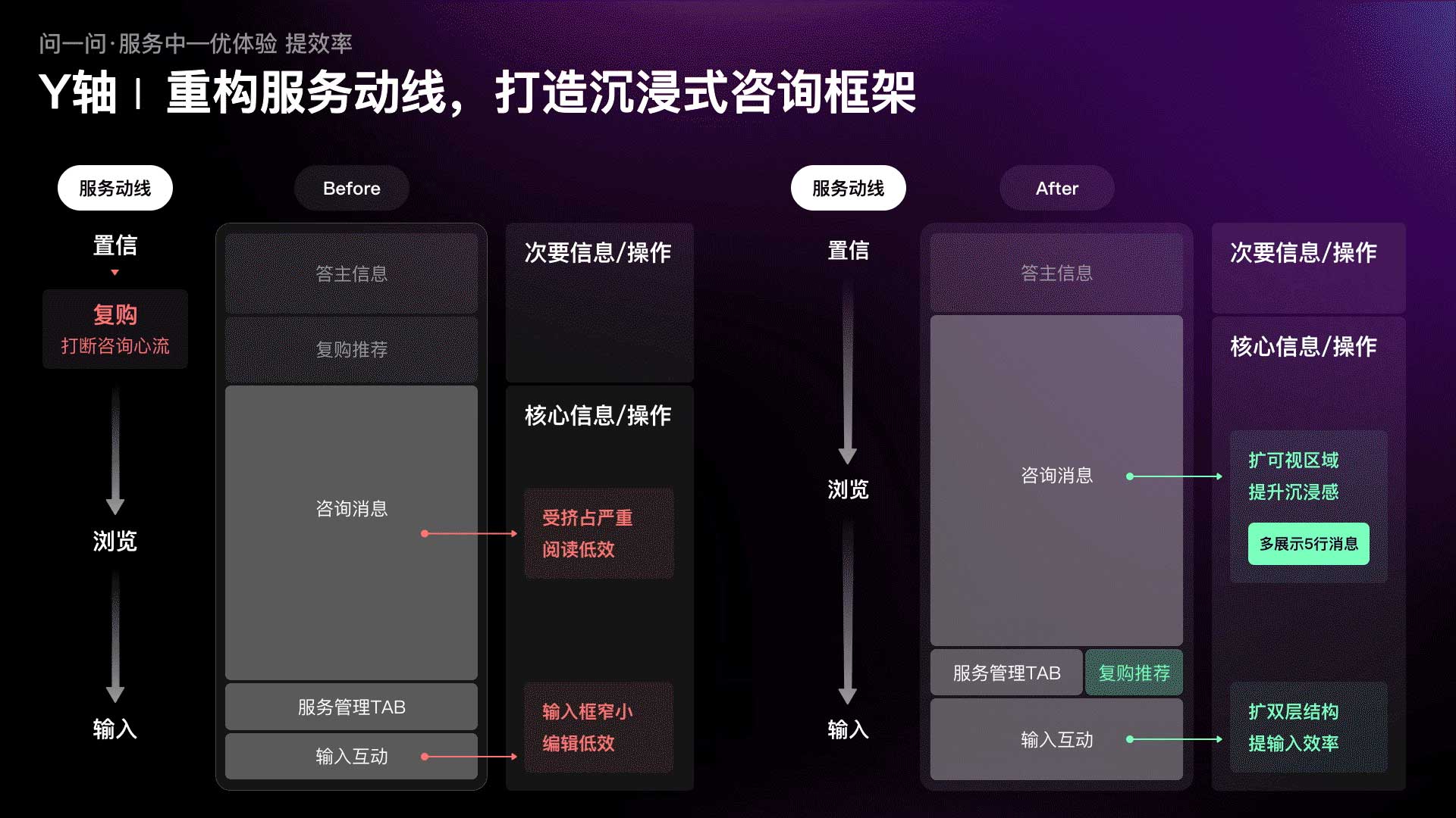 ?到了新的發(fā)展階段,我們的設(shè)計(jì)愿景該如何實(shí)現(xiàn)?問(wèn)一問(wèn)設(shè)計(jì)團(tuán)隊(duì)以“服務(wù)體驗(yàn)”為原點(diǎn),發(fā)起了C端核心服務(wù)體驗(yàn)的升級(jí)專(zhuān)項(xiàng)。借助用戶(hù)觀(guān)察、體驗(yàn)遍歷等方法,沿用戶(hù)真實(shí)體驗(yàn)路徑梳理服務(wù)“前-中-后”各階段的關(guān)鍵問(wèn)題、挖掘優(yōu)化機(jī)會(huì)。再結(jié)合設(shè)計(jì)、體驗(yàn)雙視角,建立以服務(wù)前“建認(rèn)知、促轉(zhuǎn)化”、服務(wù)中“優(yōu)體驗(yàn)、提效率”、服務(wù)后“增觸達(dá)、助留存”為核心指導(dǎo)原則的設(shè)計(jì)打法。通過(guò)切實(shí)滿(mǎn)足用戶(hù)在服務(wù)各階段需求來(lái)激發(fā)持續(xù)消費(fèi)、讓服務(wù)閉環(huán)順暢運(yùn)轉(zhuǎn),從而有效地賦能業(yè)務(wù)增長(zhǎng),達(dá)到體驗(yàn)和收入的雙豐收。