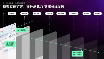 為實(shí)現(xiàn)這個(gè)目標(biāo),我們突破現(xiàn)有框架,創(chuàng)新制定了沿XYZ軸立體擴(kuò)容的思路。在Y軸方向上,進(jìn)行了屏效的優(yōu)化,滿(mǎn)足工具提效需求;沿Z軸拓展了層級(jí),滿(mǎn)足多元服務(wù)和互動(dòng)需求;最后,沿X軸探索第二空間,承載創(chuàng)新型體驗(yàn)。