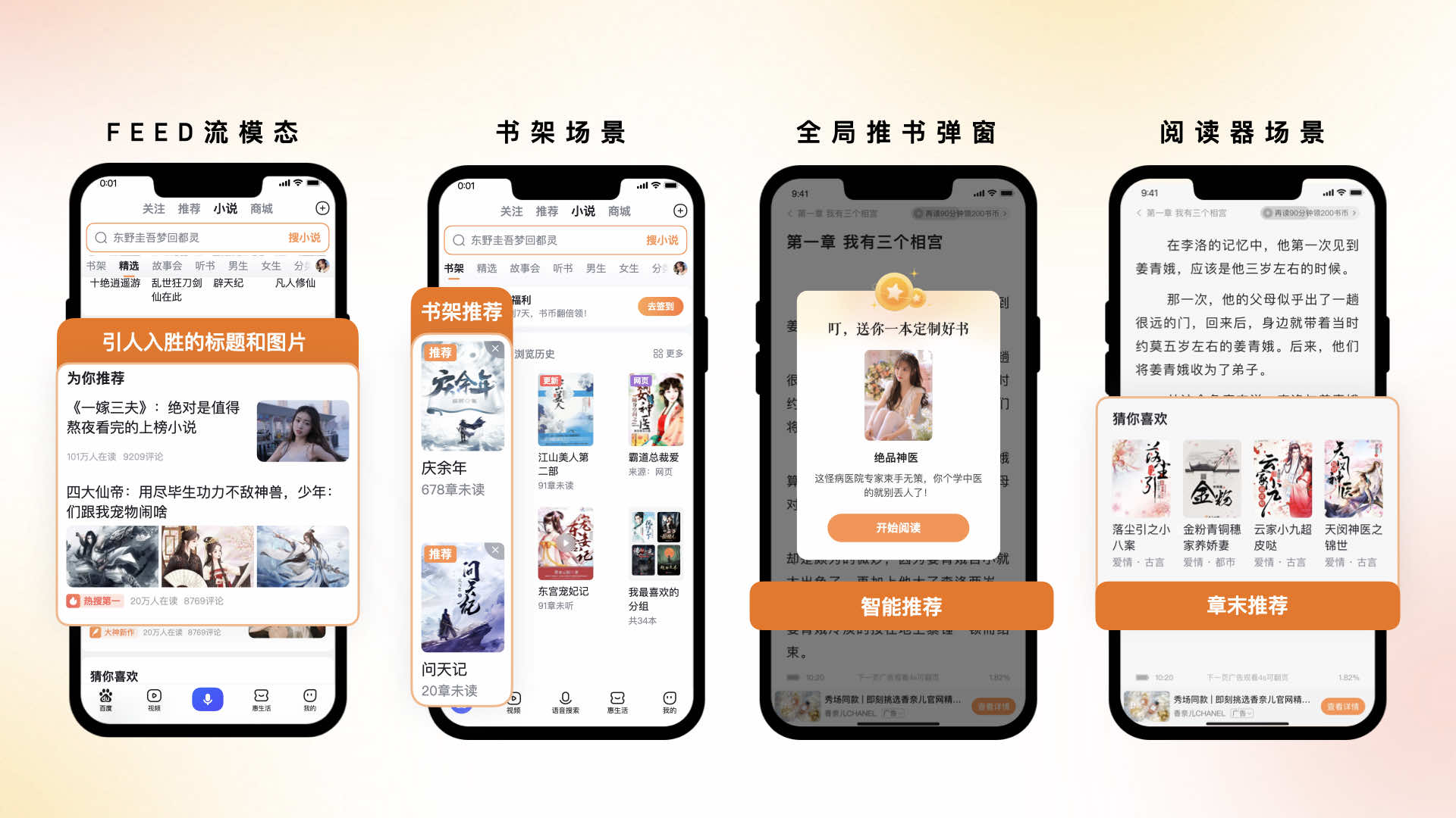 在推薦形式上,我們也采用了多樣化的推薦方式。例如在首頁增加了feed流形態(tài)的信息模塊,以更直觀的圖文展現(xiàn)方式,幫助用戶發(fā)現(xiàn)他感興趣的內(nèi)容。在書架場景,針對于書架內(nèi)容少的用戶,自動的放置兩本高流量書籍,幫助用戶高效的觸達(dá)內(nèi)容。與此同時,我們還會根據(jù)用戶行為數(shù)據(jù),采用彈窗形式和章尾推薦等形式主動向用戶推薦與其喜好度高的內(nèi)容,方便用戶高效的觸達(dá)他感興趣的內(nèi)容。