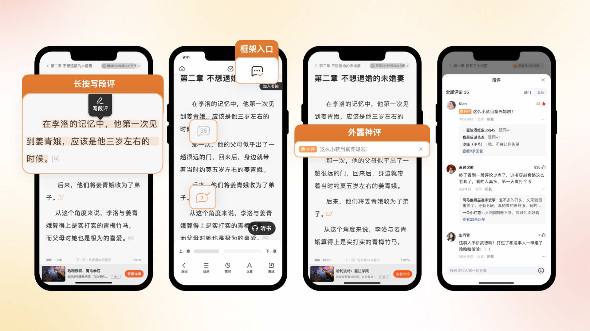 閱讀器場景是用戶使用時長最長的一個場景。因此我們?yōu)橛脩籼峁┝硕卧u功能,方便用戶閱讀過程中和書友進(jìn)行交流,為了不影響閱讀的流暢性,我們采用弱化的段評圖標(biāo)樣式和色彩,段評入口設(shè)計在段落尾部,減少對閱讀的干擾。