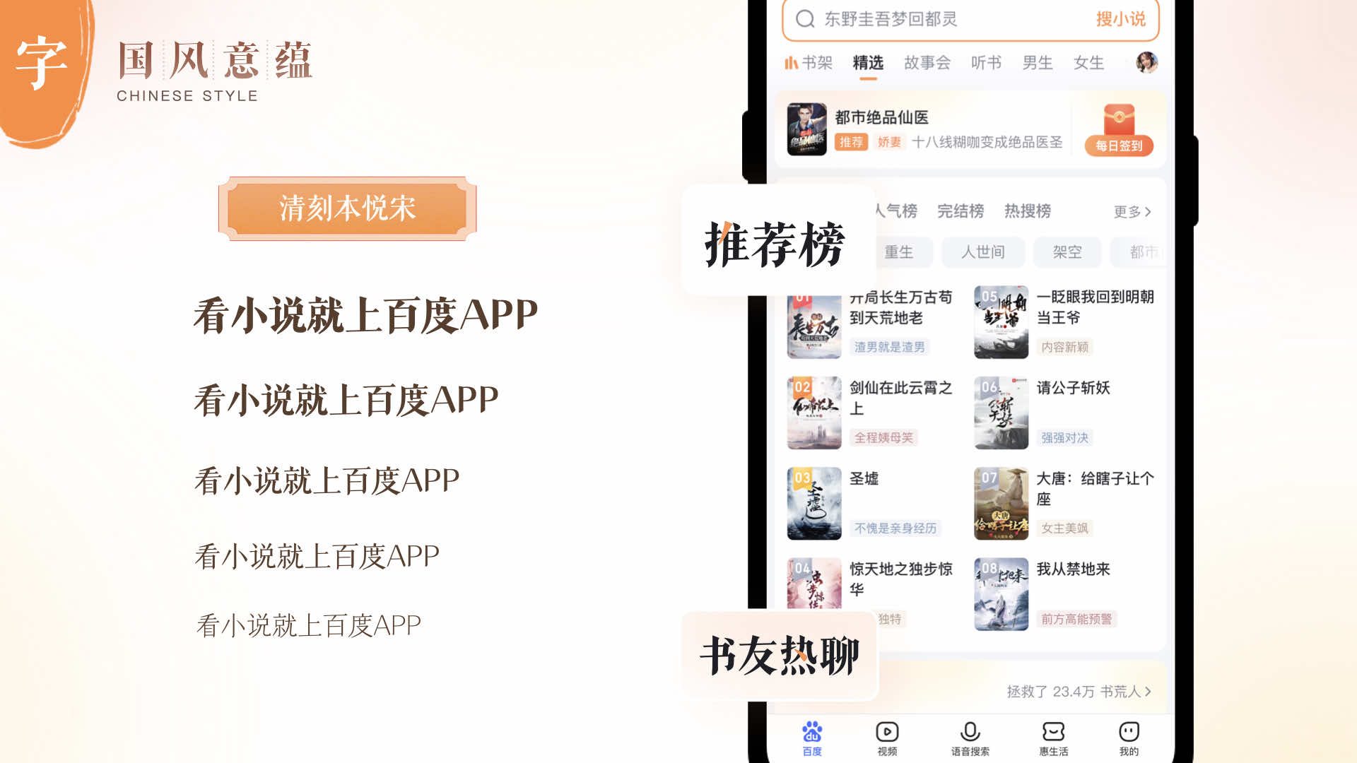基于國風(fēng)意韻感,設(shè)計團隊在文字的使用上,也選擇了一套襯線體字體,該字體字形瘦長,柔美清透且識別度高。在界面中,主要在標(biāo)題區(qū)應(yīng)用這套字體,將其中的一筆進(jìn)行跳色點綴,不僅讓用戶閱讀舒適,而且提升百度小說的品牌識別度。
