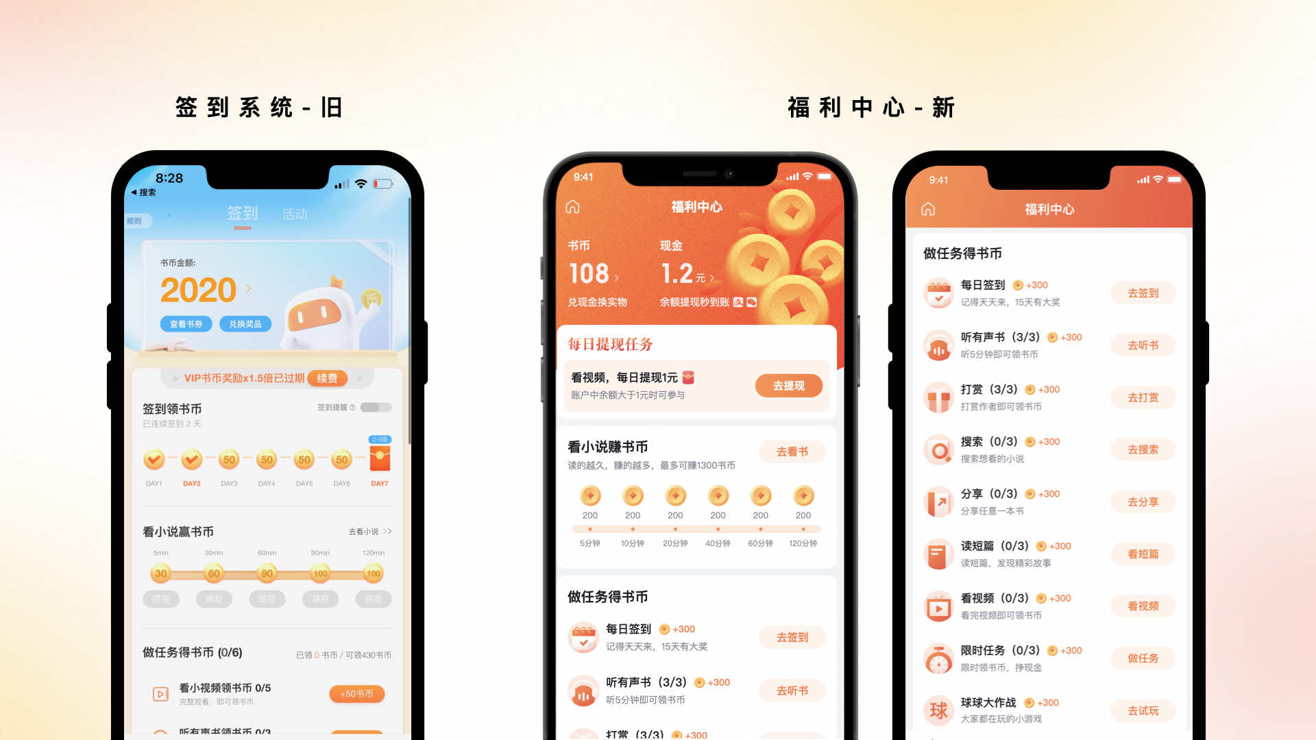 在閱讀器場景,我們增加了章尾和半層金幣領(lǐng)取提示,即時提醒用戶領(lǐng)取福利,同時,強化領(lǐng)取成功樣式,增強用戶的獲得感。