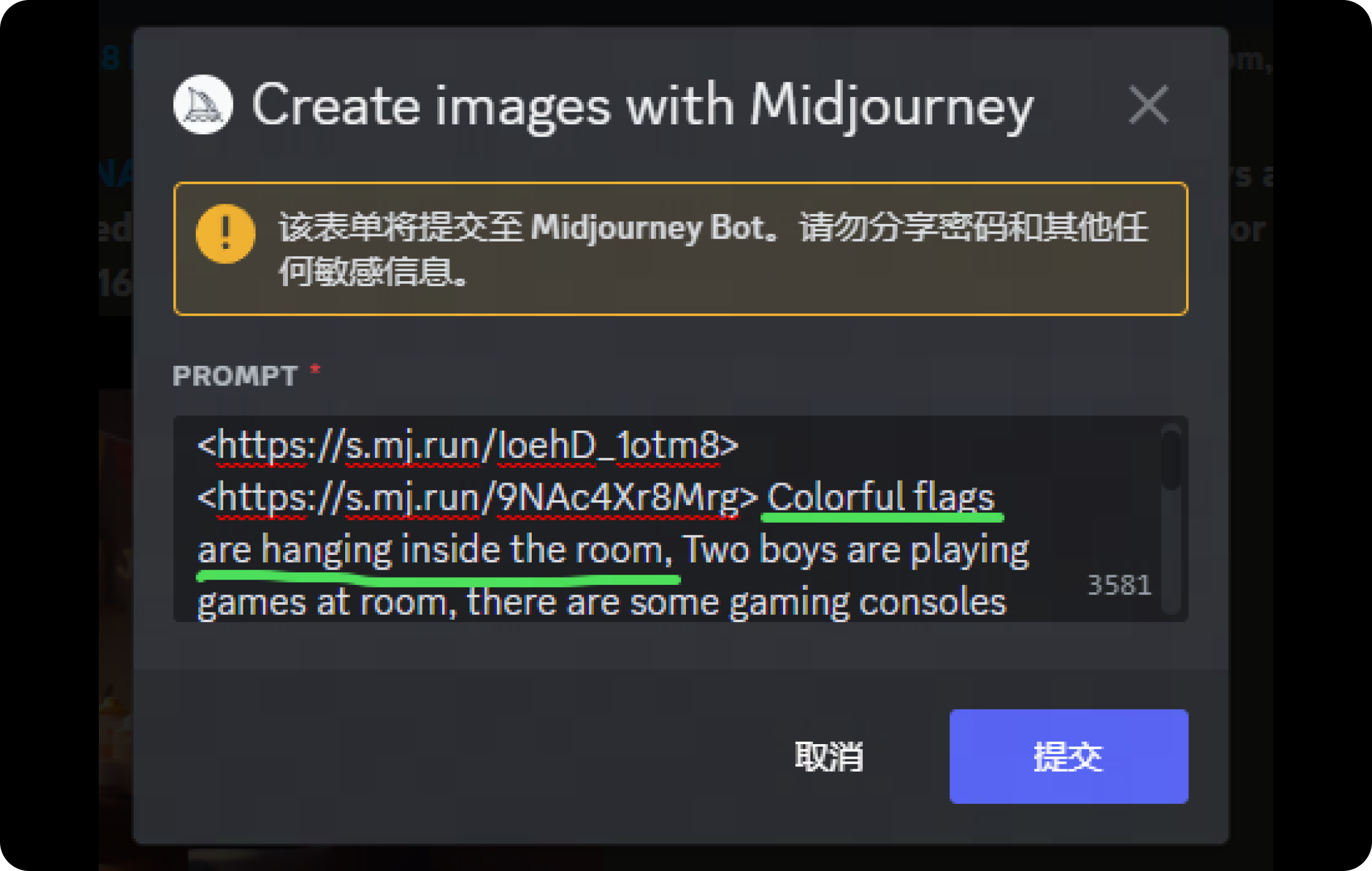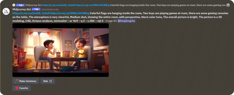 得到這張圖后,覺得畫面左上角部分有些空白,為了襯托歡快聚會的氛圍,我們決定在左上方加上掛旗。方法也是運用Midjourney的混音模式。在關(guān)鍵詞中加入“屋子里掛著彩旗”。
