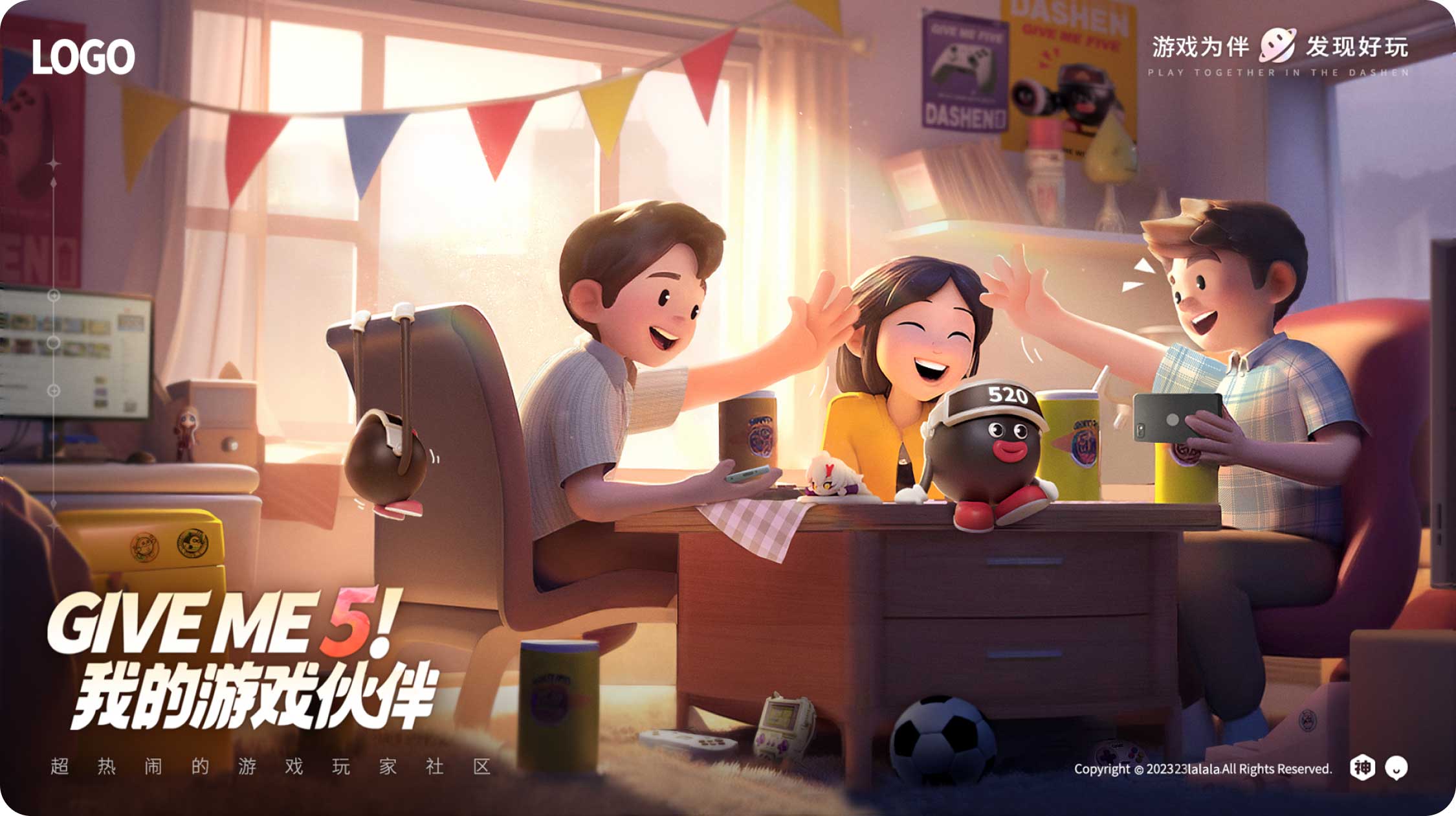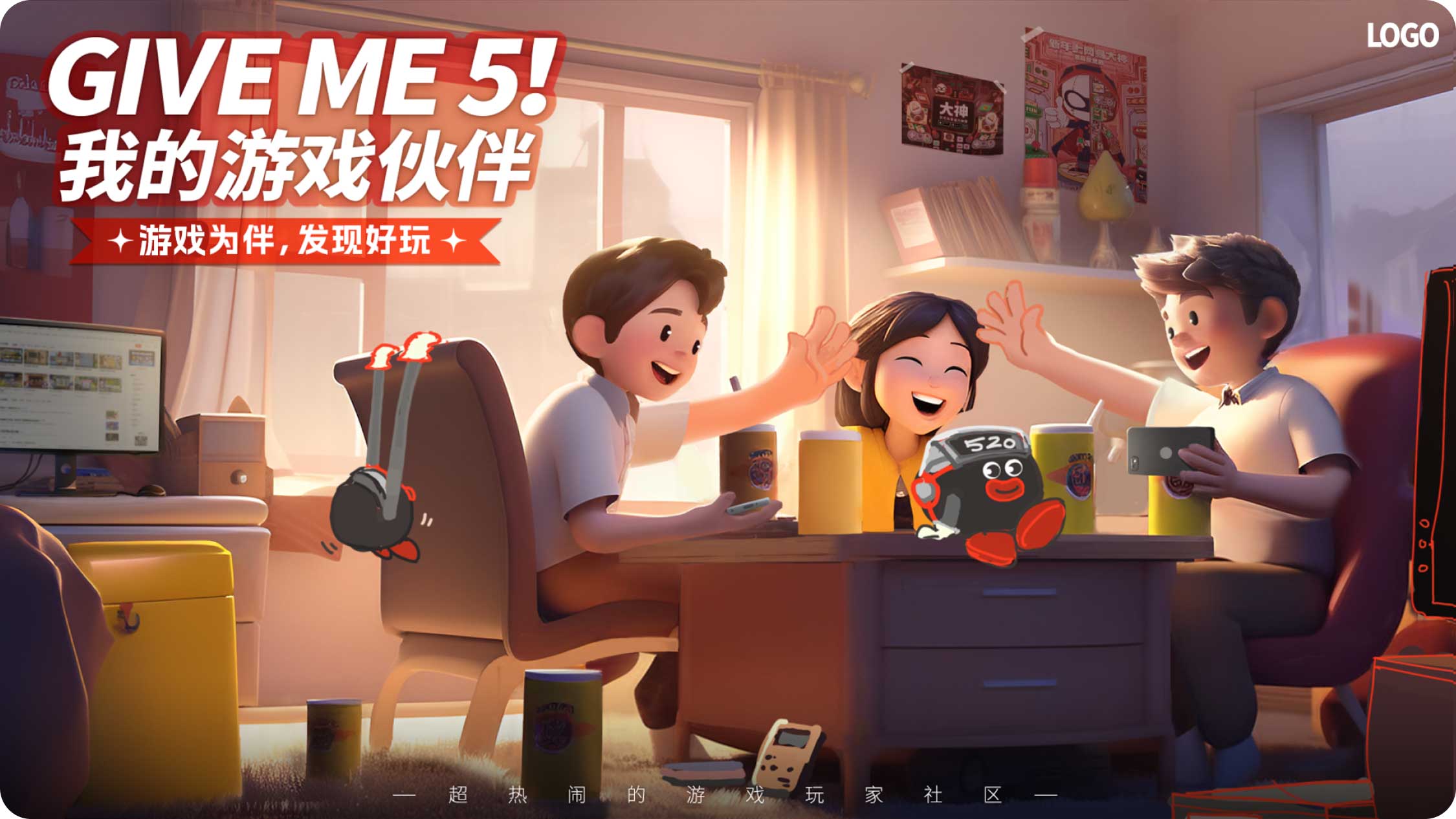 大概描繪了幾個伙伴在組隊玩游戲,因為獲得了勝利相互擊掌(give me 5)的輕松愉快的畫面。周圍有一些和游戲相關(guān)的元素,IP形象也在畫面中心露出,強調(diào)與品牌之間的關(guān)系。