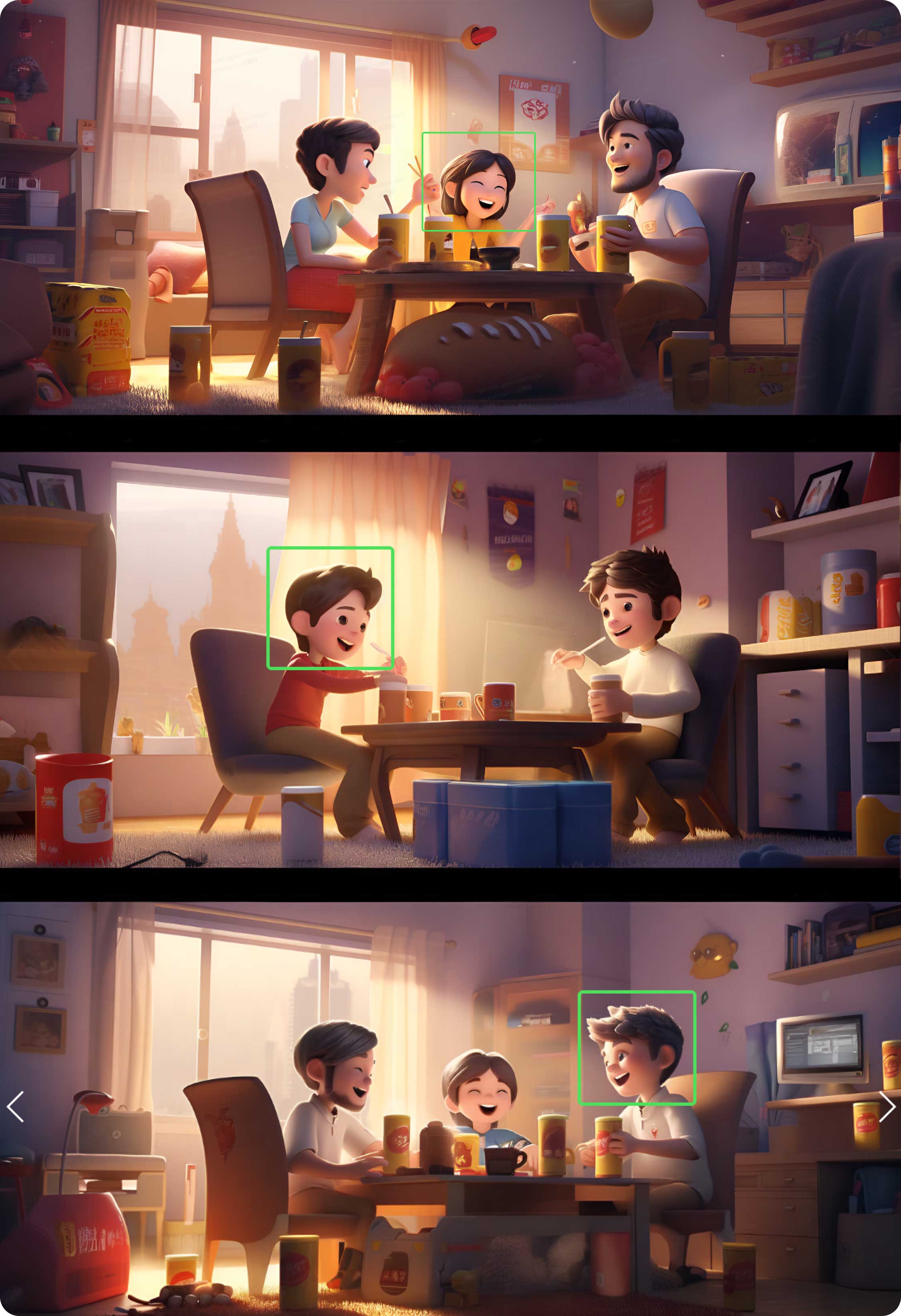在前期,我們對構(gòu)想的畫面進行關(guān)鍵詞的描述:“可愛帥氣的男女孩子們一起玩手機,開心地微笑著,舉起手歡呼,溫暖的房間,大型落地窗?!睂㈥P(guān)鍵詞翻譯后放入Midjourney中進行煉圖,最終篩選了幾張氛圍還不錯的進行下一步操作。