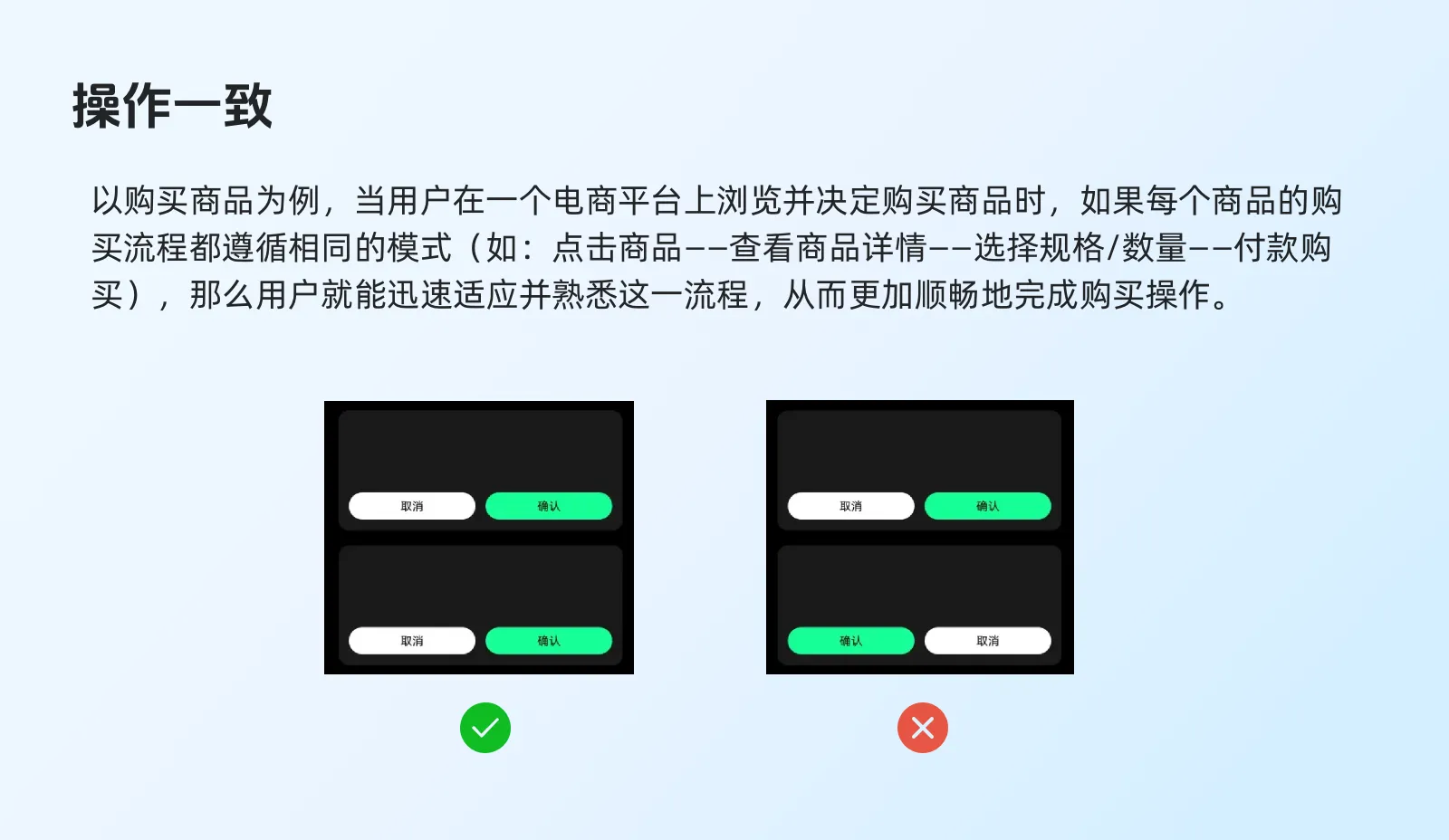 :確保用戶在執(zhí)行相似任務(wù)時,如購買商品、搜索信息或提交表單等,能夠遵循相同的操作流程。這有助于用戶快速適應(yīng)并高效完成任務(wù)。