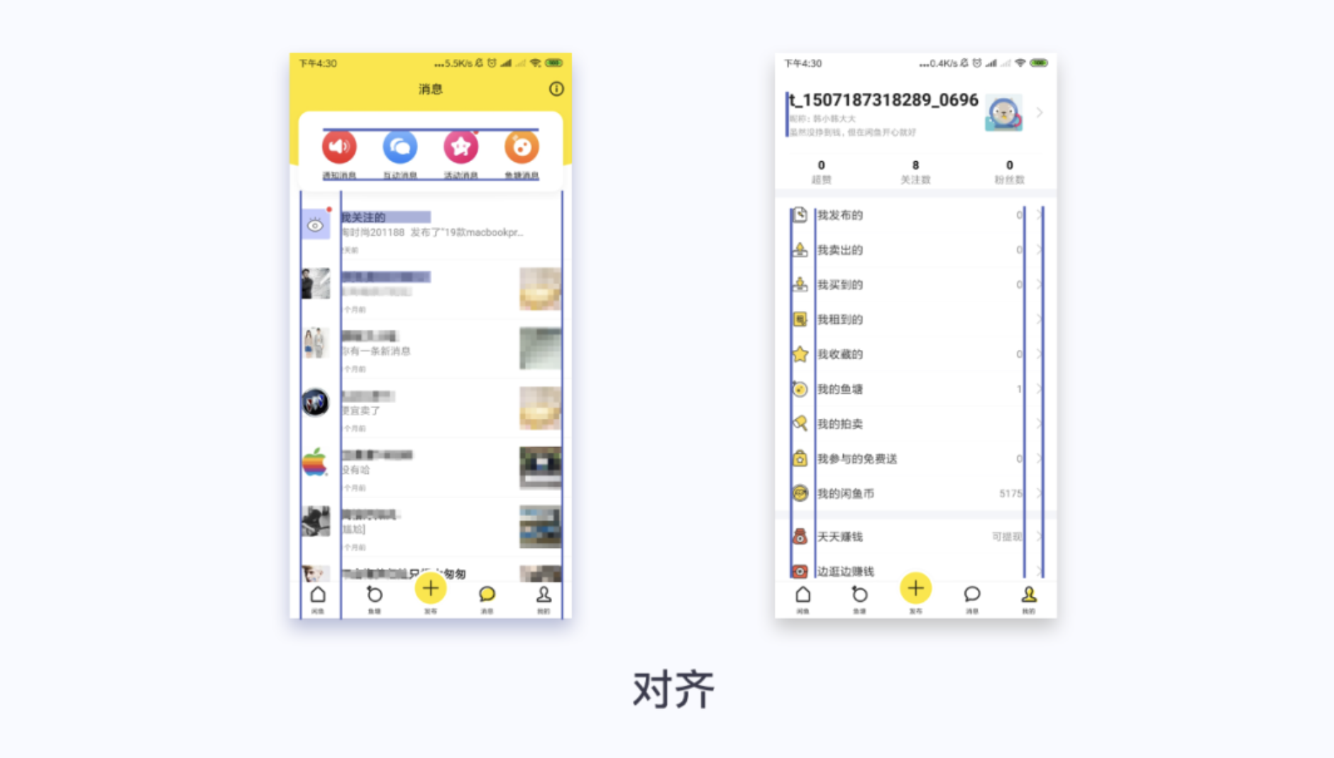 閑魚消息頁面頂部功能區(qū)域采用居中對(duì)齊方式,比較正式一些,突出顯示引導(dǎo)用戶點(diǎn)擊;個(gè)人頭像和消息左對(duì)齊顯示,發(fā)布圖片右對(duì)齊顯示。