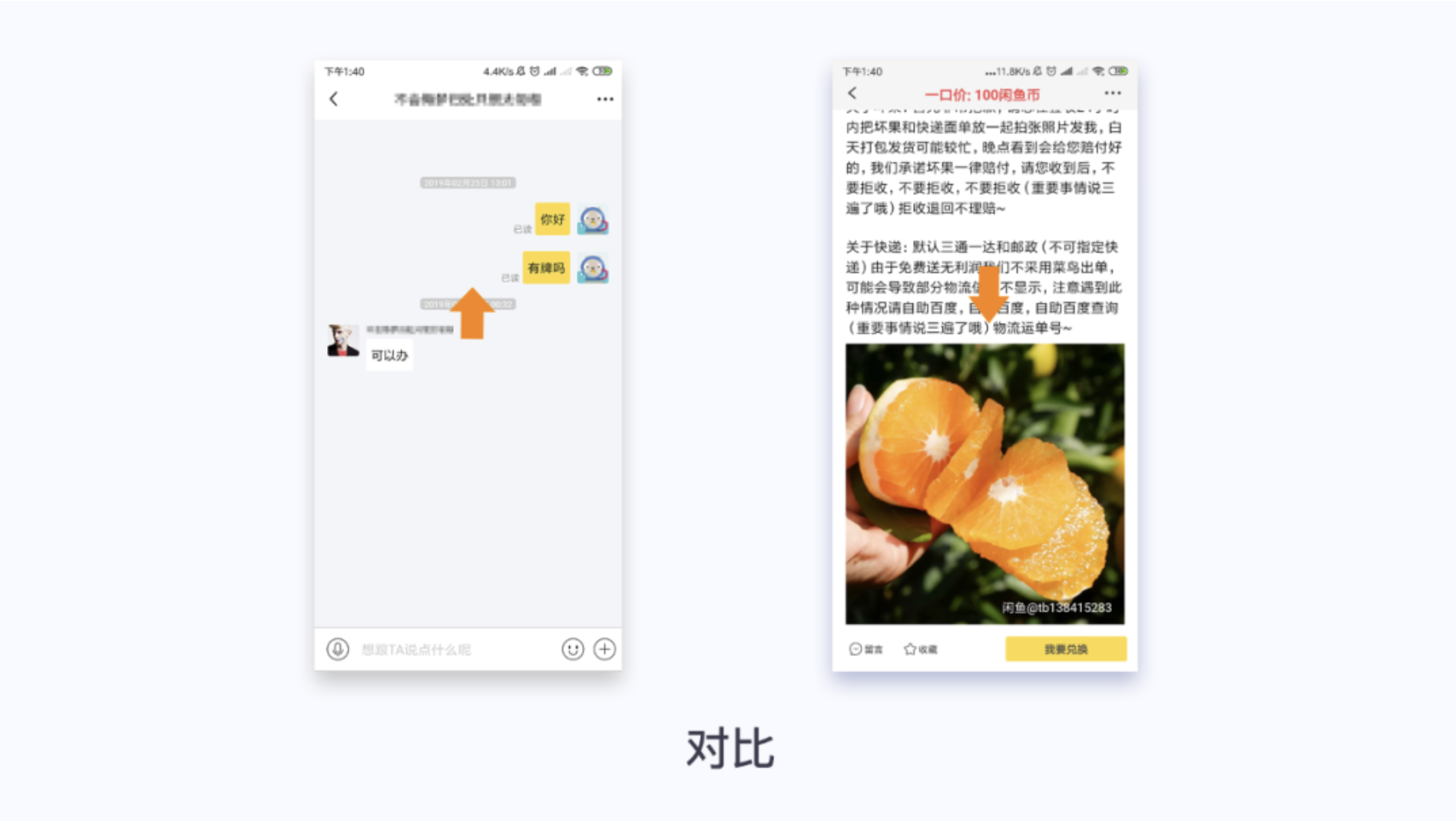閑魚聊天頁面,雙方消息顏色對(duì)比,色彩的對(duì)比更加強(qiáng)的雙方聊天的視覺效果,對(duì)比也是比較明顯。