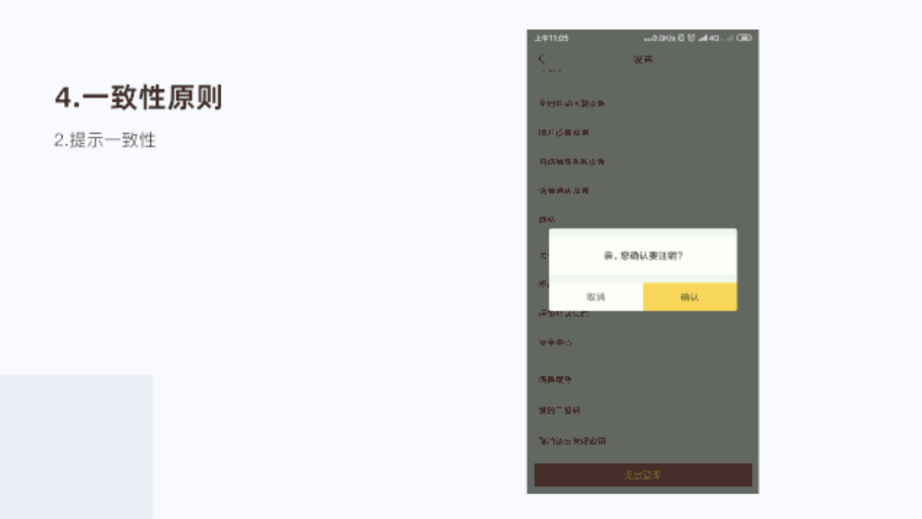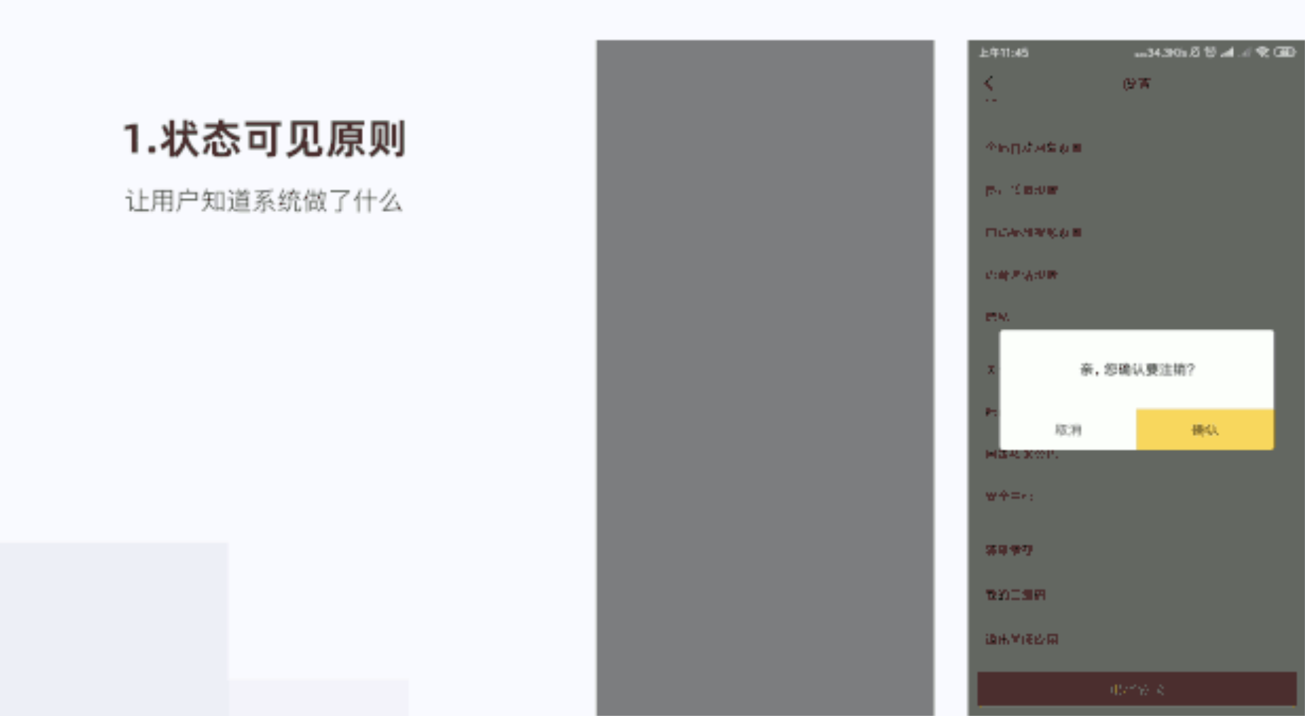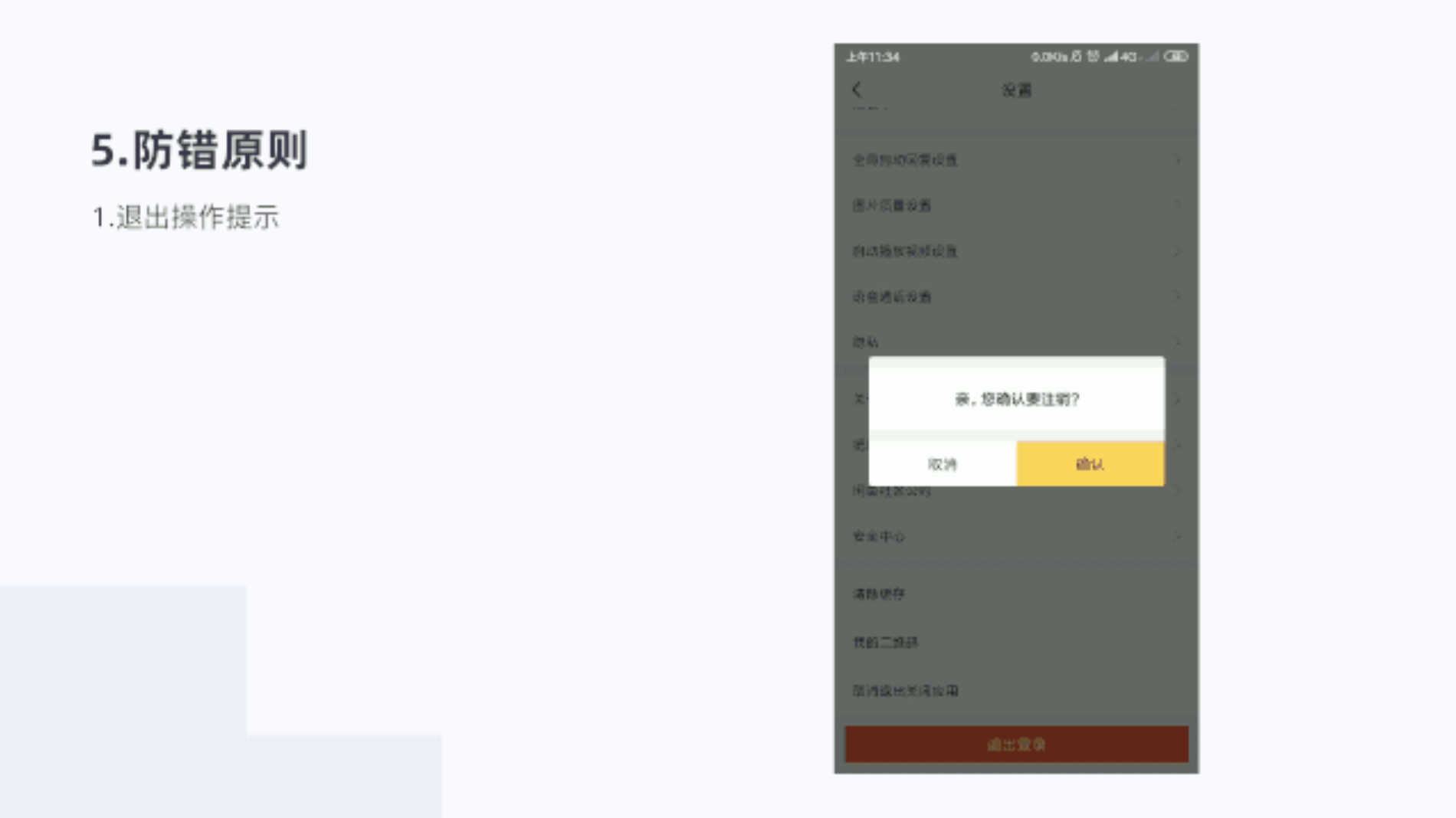 在退出登錄提示是否要注銷登錄,把確認(rèn)層級(jí)加大,放在右邊,清晰提示用戶,防止用戶出錯(cuò)