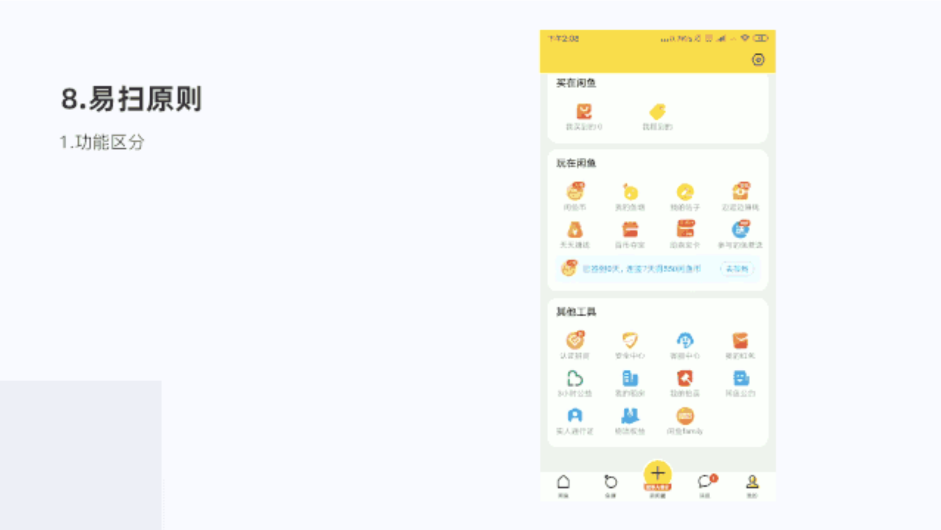 閑魚的我的頁面,每個(gè)區(qū)塊進(jìn)行功能區(qū)分,分為買、賣、玩、其他4個(gè)主要部分。降調(diào)層級(jí),同時(shí)在區(qū)塊內(nèi)每個(gè)功能圖標(biāo)宮格顯示,也易于用戶查找,滿足了易掃原則,提示了用戶體驗(yàn)。