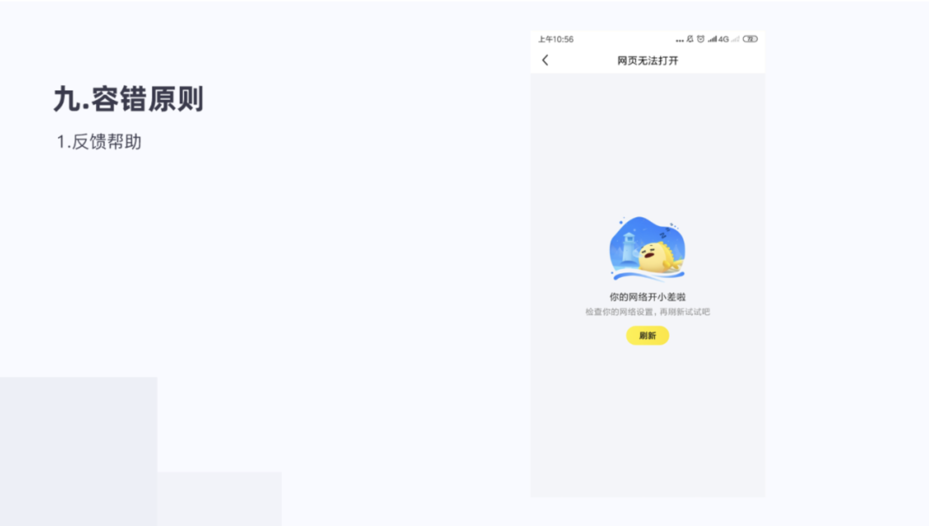 當(dāng)頁面缺失時(shí),畫面出現(xiàn)可愛的卡通缺失頁,產(chǎn)生情感共鳴,同時(shí)減少了用戶的認(rèn)知負(fù)擔(dān),讓用戶知道了所處位置和過程。