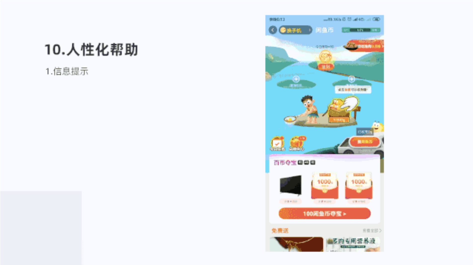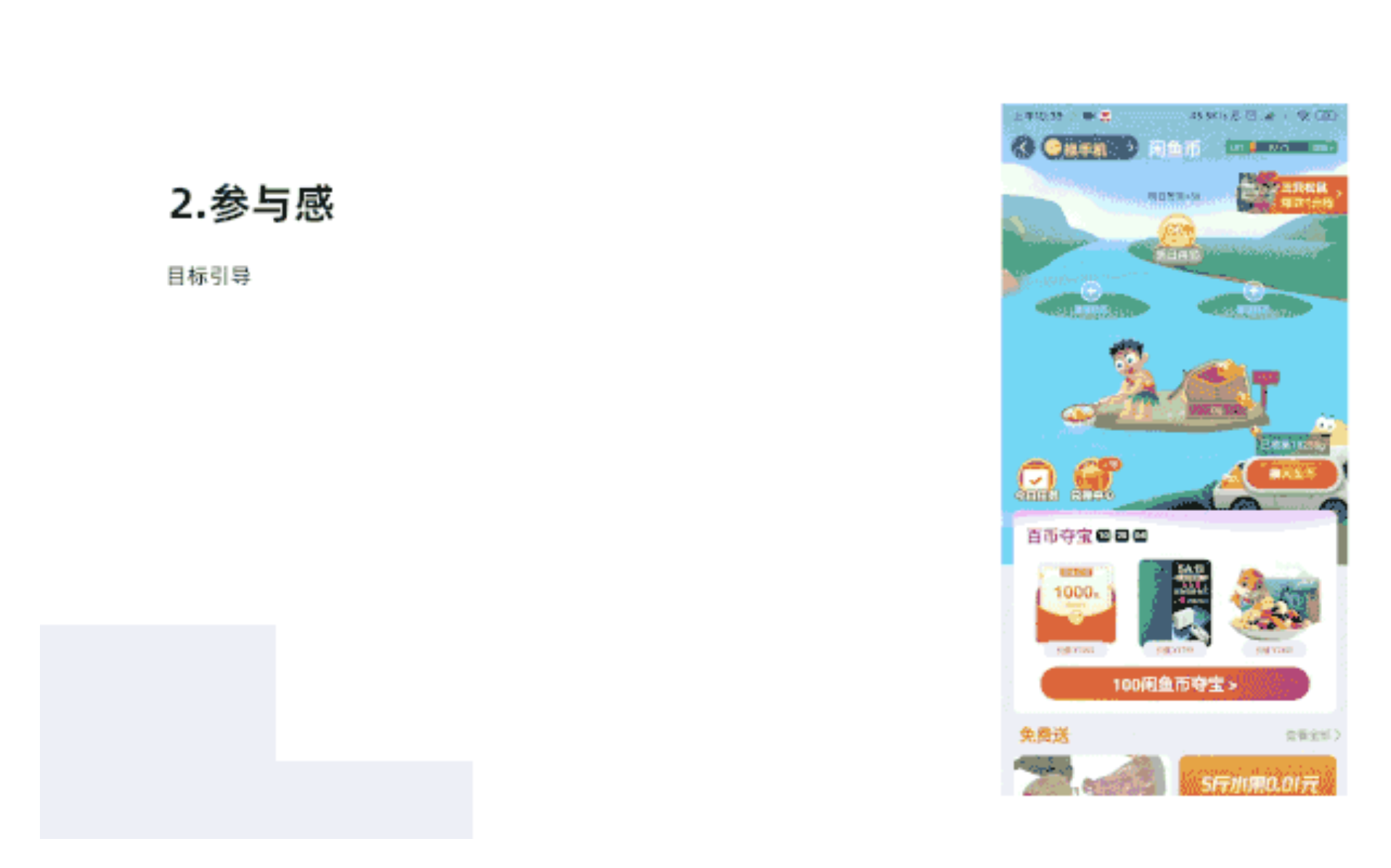 目標(biāo)引導(dǎo)設(shè)計(jì),劃定規(guī)則和目標(biāo)路徑,引導(dǎo)用戶參與其中,在簽到活動(dòng)頁面一個(gè)小路徑,用戶點(diǎn)擊撈魚,撈上來之后,就可以兌換閑魚幣了,讓用戶趣味游戲同時(shí)獲得閑魚幣,提升參與感,增強(qiáng)了用戶體驗(yàn)。