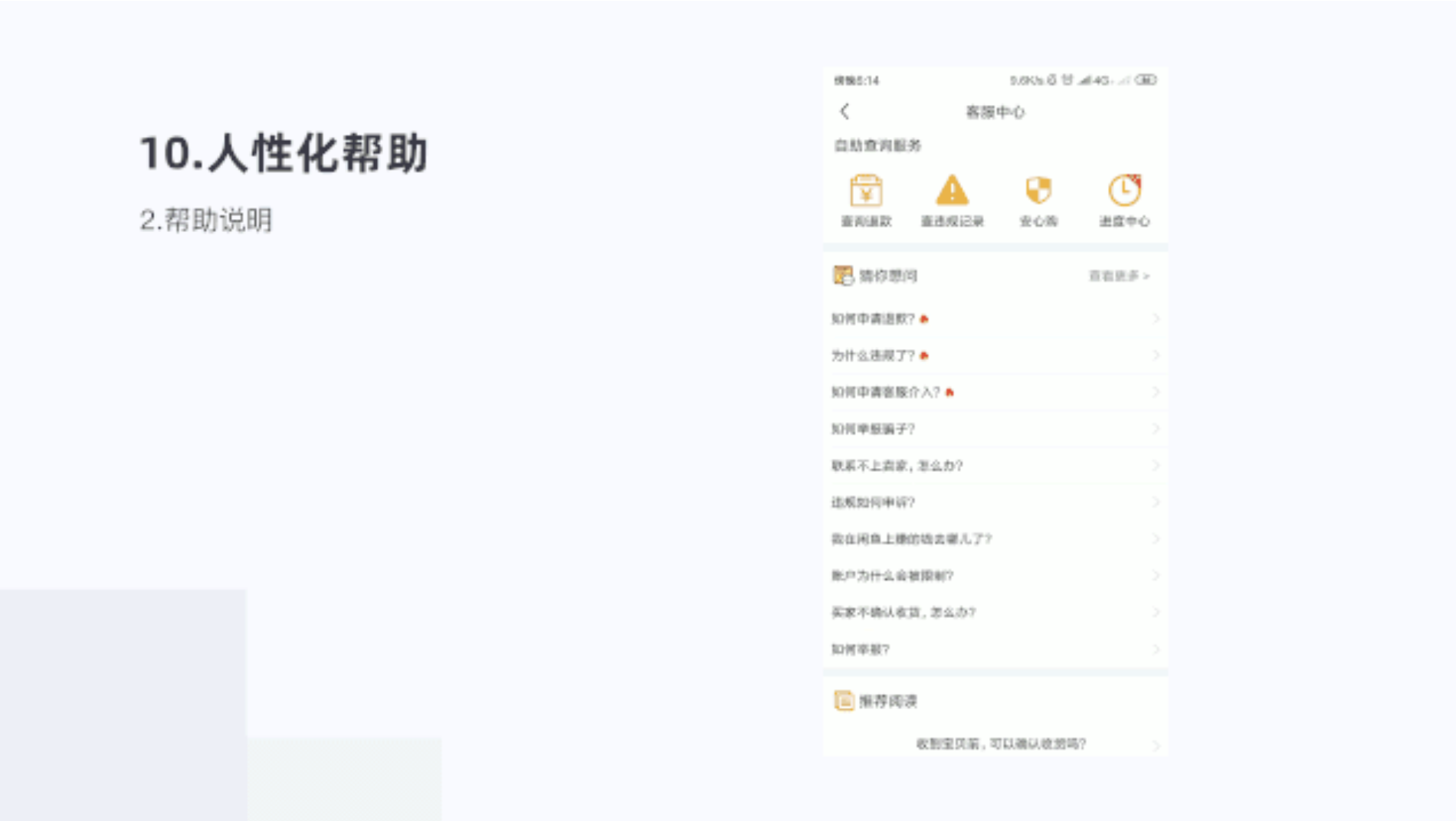閑魚的幫助說明功能更加全面,滿足不用用戶場(chǎng)景的問題需求,也能及時(shí)和客戶進(jìn)行咨詢反饋信息。