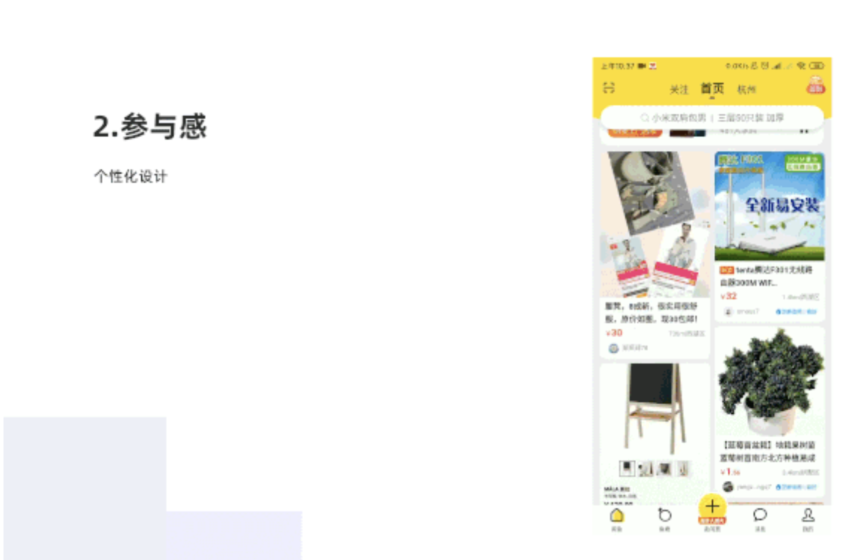 個(gè)性化設(shè)計(jì),為用戶提供獨(dú)一無二的個(gè)性化設(shè)計(jì),帶來個(gè)性化服務(wù),滿足用戶對(duì)閑置產(chǎn)品的需求,也同時(shí)滿足用戶發(fā)布閑置同類商品可參考的需求。當(dāng)用戶想購(gòu)買閑置植物盆栽比較多時(shí),首頁就會(huì)出現(xiàn)推薦的盆栽商品。