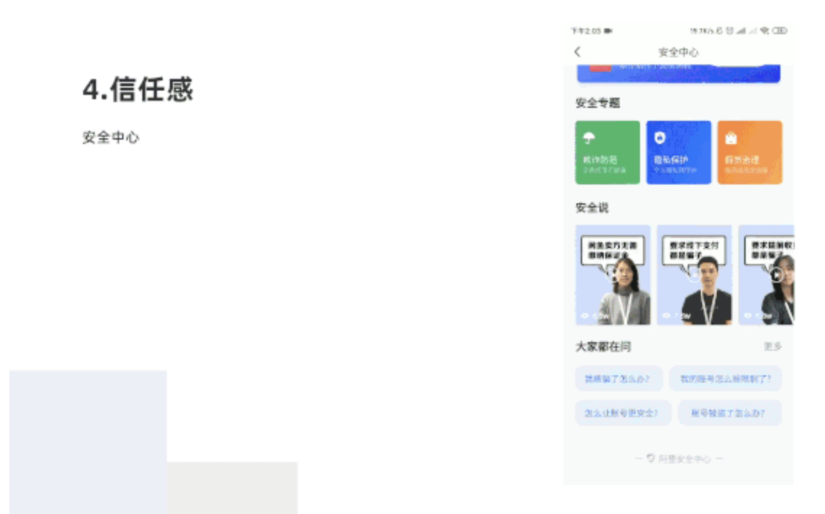 我的頁面有安全中心,可以購(gòu)買欺詐保障,了解安全知識(shí)和安全操作,減輕用戶交流,提升信任感。