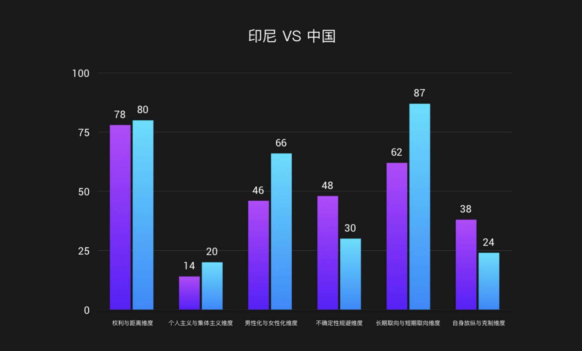 首先建立文化場(chǎng)景,如上圖所示,主體國(guó)家是印尼,對(duì)比國(guó)家是中國(guó)。對(duì)印尼和中國(guó)的群體進(jìn)行文化維度分析。