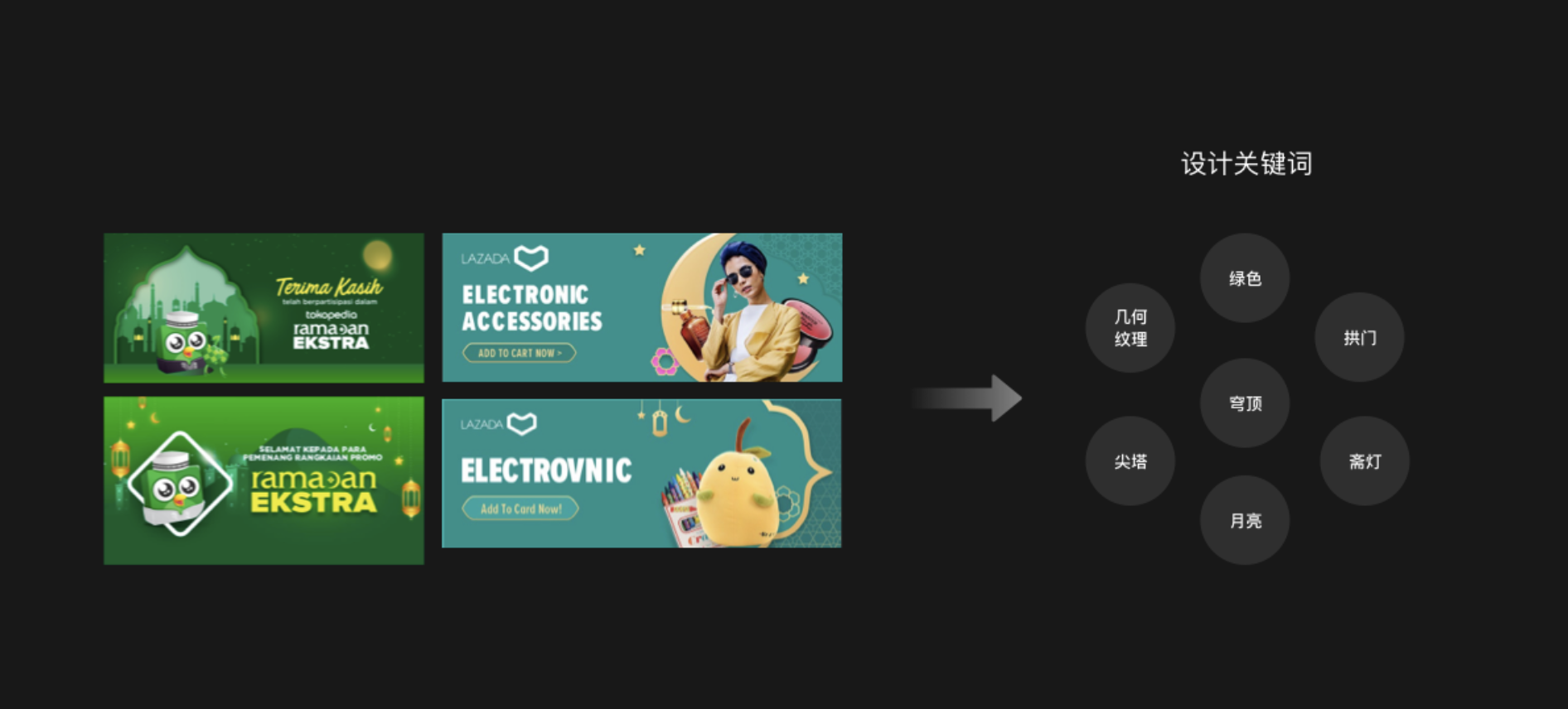 所以在這個(gè)期間做活動(dòng)宣傳時(shí),可以多運(yùn)用伊斯蘭教的一些元素,例如:齋月的齋燈,月亮,以及伊斯蘭教寺廟的尖塔、穹頂和幾何紋理的裝飾等等,都可以融入到設(shè)計(jì)中,形成獨(dú)特的本土風(fēng)格,更容易獲得當(dāng)?shù)厝说南矏?ài)和認(rèn)可。