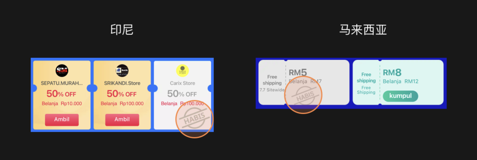 比如說(shuō)優(yōu)惠券的 Ran out 狀態(tài),印尼和馬來(lái)都是 Habis, 都代表結(jié)束的意思。