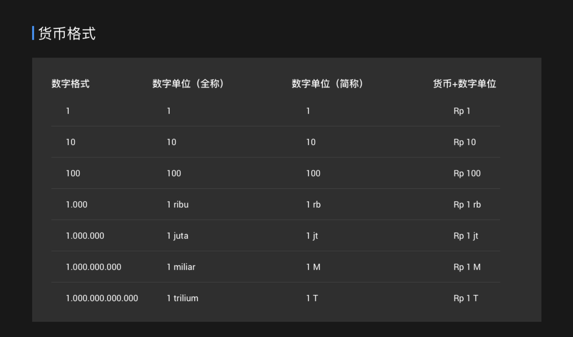印尼的貨幣符號(hào)是 Rp,貨幣名稱是 IDR ( 印度尼西亞盧比)。 在印尼,表示千位的寫(xiě)法有兩種,Rp2.000 或者是 Rp2 rb ( rb 是 ribu 的縮寫(xiě) ), 但是 Rp2.000 的用法更多些。印尼沒(méi)有萬(wàn)的概念,對(duì)于大額的數(shù)字,在正式場(chǎng)景中,比如商品標(biāo)價(jià)或銀行的收據(jù),都會(huì)將金額全部展示出來(lái),不會(huì)使用縮寫(xiě)。只有在非正式場(chǎng)合,例如需要快速吸引人眼球的新聞標(biāo)題或海報(bào)中才會(huì)出現(xiàn)。