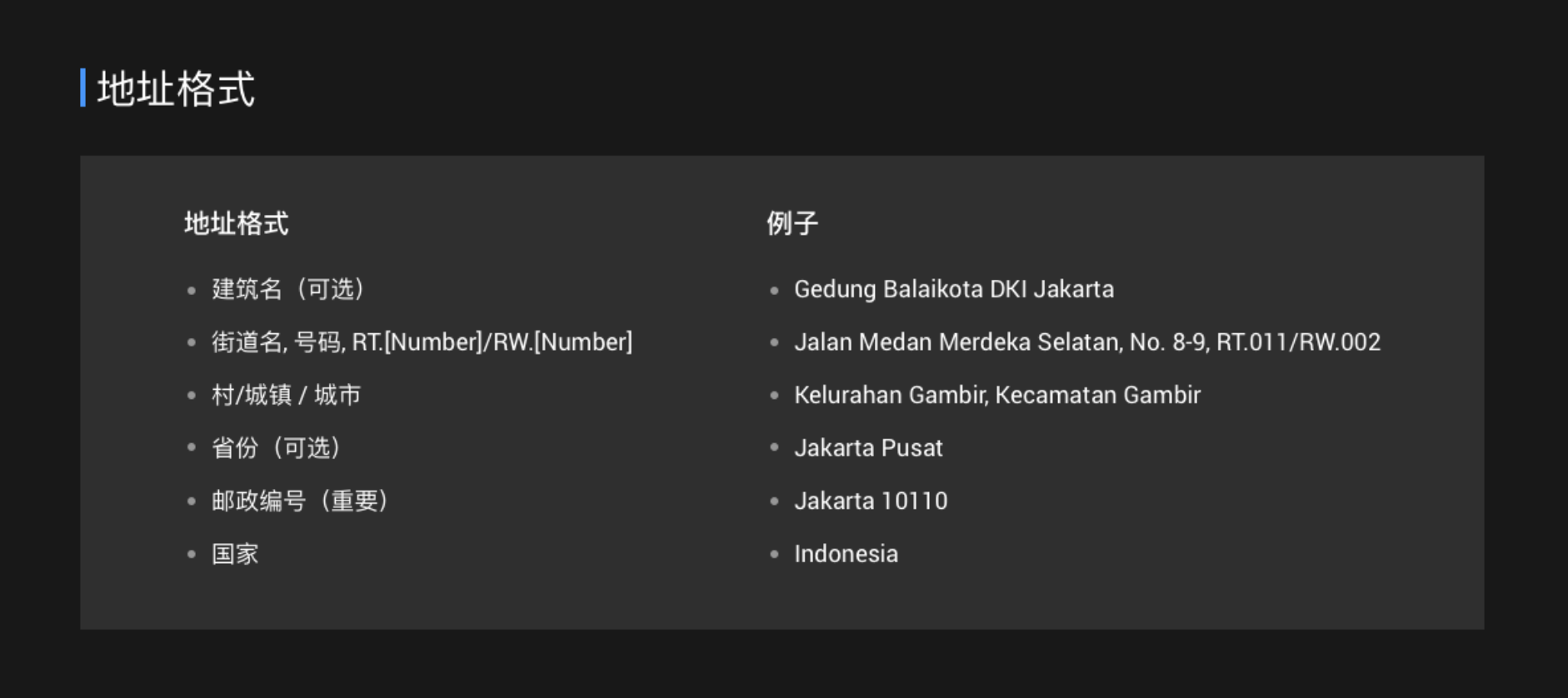 中國(guó)的地址格式是:從大到小,從國(guó)家再到街道。而印尼的地址格式和西方的寫(xiě)法一樣,從小到大。