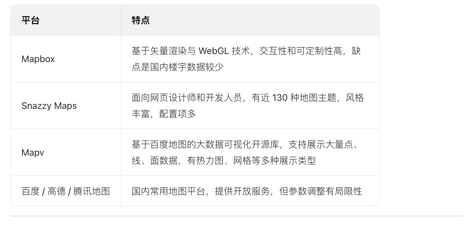 - 技術(shù)能力:可制作 2D、3D 矢量、邊界、瓦片地圖,支持交互、漫游(如點擊下鉆到區(qū)縣),可添加飛線層、氣泡層、熱力層等多層數(shù)據(jù)并設(shè)置不同效果。