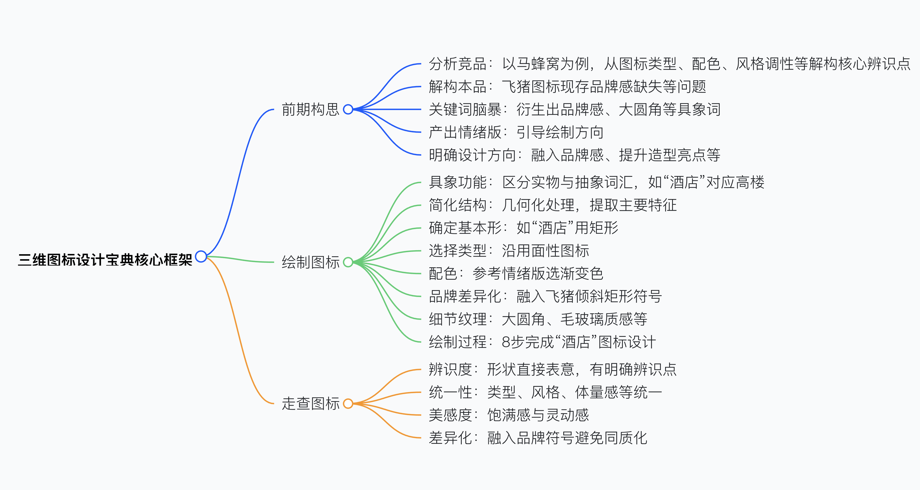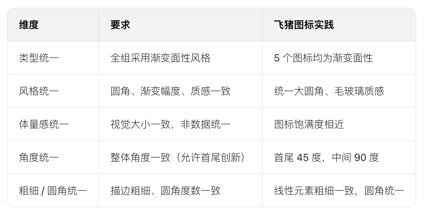 “三維圖標(biāo)設(shè)計寶典” 方法論,強調(diào)從前期構(gòu)思(分析競品如馬蜂窩與本品飛豬的圖標(biāo)類型、配色、風(fēng)格及核心辨識點,通過關(guān)鍵詞腦暴鎖定 “品質(zhì)、活力、青春” 方向并產(chǎn)出情緒版)、繪制圖標(biāo)(具象功能、簡化結(jié)構(gòu)、確定基本形,融入飛豬品牌超級符號,添加毛玻璃質(zhì)感等細(xì)節(jié))到走查圖標(biāo)(從辨識度、統(tǒng)一性、美感度、差異化四方面檢查,如類型、風(fēng)格、體量感統(tǒng)一,融入品牌符號增強差異化)的完整流程,助設(shè)計師提升過稿率。