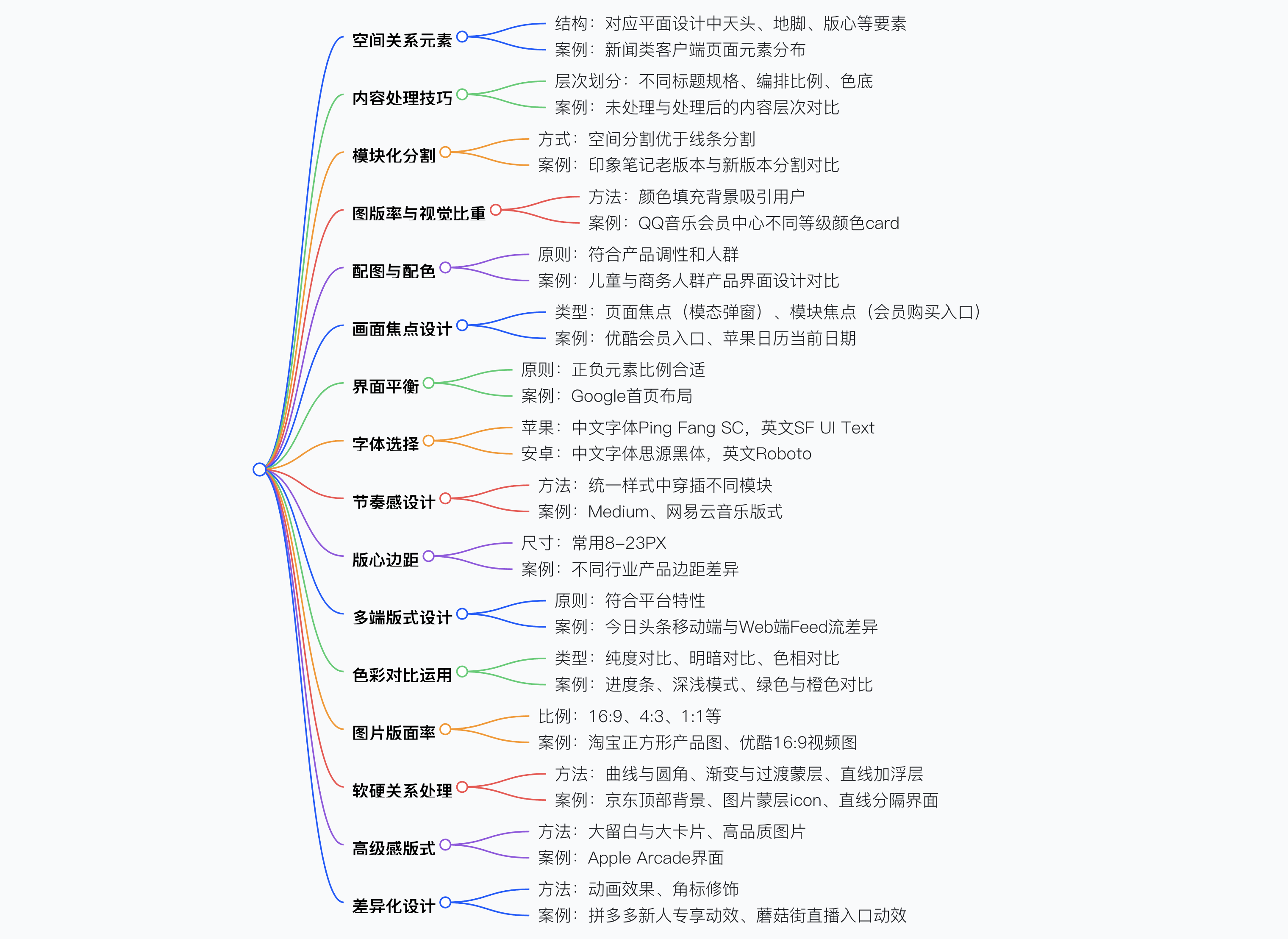 UI 界面版式設(shè)計(jì)的實(shí)用技巧,包括運(yùn)用平面設(shè)計(jì)結(jié)構(gòu)理解界面空間元素分布,通過(guò)不同標(biāo)題規(guī)格等處理內(nèi)容過(guò)多問(wèn)題,采用空間分割替代線條分割,利用顏色填充背景改變圖版率,根據(jù)產(chǎn)品調(diào)性選擇配圖及配色,通過(guò)模態(tài)彈窗等突出畫面焦點(diǎn),注重界面平衡,選擇合適字體(蘋果常用 Ping Fang SC、SF UI Text 等,安卓常用思源黑體、Roboto 等),設(shè)計(jì)有節(jié)奏感的版式,參考常用版心邊距(8-23PX),考慮多端平臺(tái)特性進(jìn)行版式設(shè)計(jì),運(yùn)用純度、色相對(duì)比等色彩對(duì)比手法,有效利用 16:9 等圖片版面率,通過(guò)曲線與圓角等處理版式軟硬關(guān)系,利用大留白與大卡片營(yíng)造 “高級(jí)感”,采用增加動(dòng)畫效果等差異化設(shè)計(jì)方法。