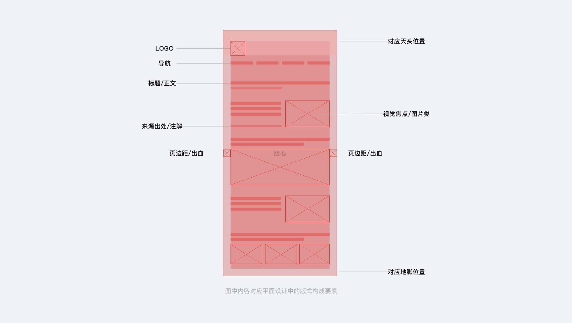 - 空間關(guān)系元素:運(yùn)用平面設(shè)計(jì)中的天頭(LOGO、導(dǎo)航)、版心(標(biāo)題 / 正文、視覺焦點(diǎn))、地腳(來(lái)源出處)等結(jié)構(gòu)思考 UI 界面布局,如新聞?lì)惪蛻舳隧?yè)面元素對(duì)應(yīng)分布。