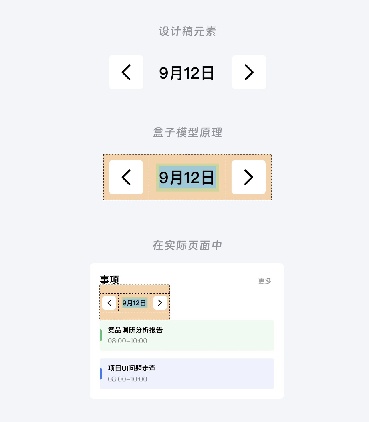 - 案例實(shí)操:以 “9 月 12 日” 的日程元素為例,其內(nèi)容(如事項(xiàng)名稱、時(shí)間)對應(yīng) content,內(nèi)容與邊框的距離為 padding,元素邊框?yàn)?border,與其他元素的間距為 margin。通過調(diào)整這些屬性,可讓元素按設(shè)計(jì)稿布局整齊排列。