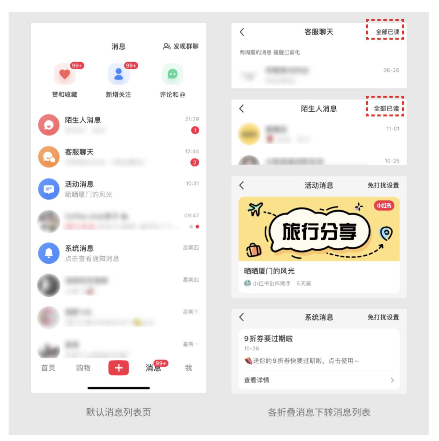 但到了 “客服聊天” 和 “陌生人消息” 里,“全部已讀” 就出現(xiàn)了??头⒋蠖嗍?“訂單咨詢”“售后反饋”,事情解決后就成了沒用的歷史記錄;陌生人消息里可能有營銷騷擾,默認折疊還能避免打擾。我上次在小紅書買衣服,和客服聊完尺碼后,點 “全部已讀” 把對話清掉,消息頁瞬間清爽,也不會誤刪重要的社交消息。