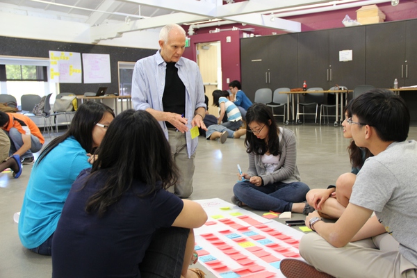 (圖為學員們在D.School用便利貼和海報紙來記錄想到的點子,白發(fā)老爺爺是D.School的講師,以前是Yahoo的PM,專門帶Ideate這一部分,講師們都有自己最擅長和最喜歡帶的一個模塊)