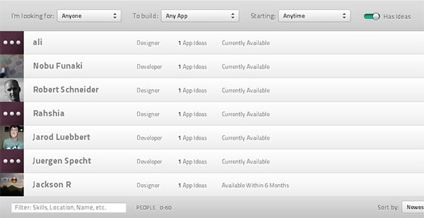 當(dāng)有大量數(shù)據(jù)要處理的時(shí)候過濾就很有用。使用下拉列表,單選按鈕或者復(fù)選框進(jìn)行過濾選擇。 在下面的例子里, builditwith.me使用下拉列表來對(duì)用戶的職業(yè)興趣和當(dāng)前狀態(tài)進(jìn)行過濾。