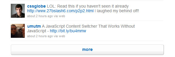 這種方式有一種變異版(或者說另外一種方式)。與不間斷的滾動(dòng)顯示數(shù)據(jù)不同,在列表的最后,用戶可以選擇點(diǎn)擊更多按鈕瀏覽數(shù)據(jù)。Twitter就是這樣的一個(gè)好范例。