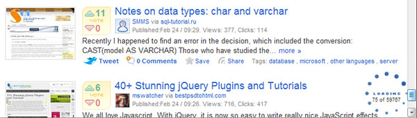 與分頁相反,連續(xù)滾動(dòng)是一種新型的數(shù)據(jù)顯示方式。這種方式不需要選擇特定的數(shù)據(jù)類型,新的數(shù)據(jù)被加到列表里。在加載的時(shí)候顯示進(jìn)度,如下例所示,在dzone.com里,進(jìn)度條顯示有多少項(xiàng)已經(jīng)被加載。
