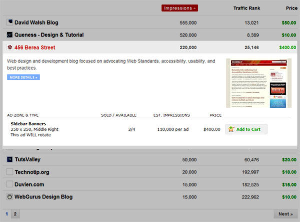 關(guān)于這種模式我寫過一篇文章,也建了一個(gè)可以輕松實(shí)現(xiàn)的jQuery小插件。 這種模式的關(guān)鍵點(diǎn)就是可以給表格增加更多相關(guān)信息功能。以BuySellAds為例,展開行顯示了出版商的廣告詳細(xì)信息,同時(shí)始終顯示主行里的重要信息。